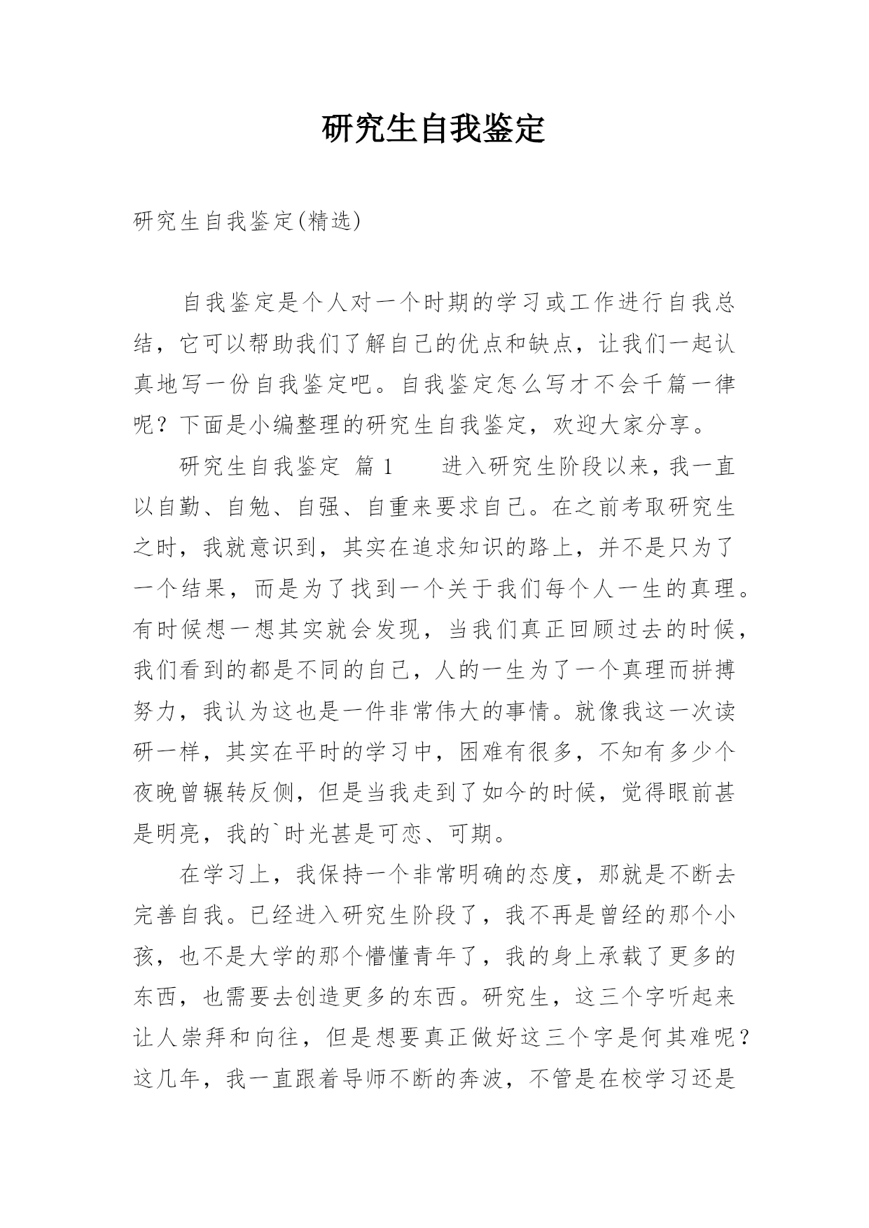 研究生自我鉴定研究生自我鉴定(精选)自我鉴定是个人对一个时期的学习或工作进行自我总结,它可以帮助我们了解自己的优点和缺点,让我们一起认真地写一份自我鉴定吧。自我鉴定怎么写才不会千篇一律呢?下面是小编整理的研究生自我鉴定,欢迎大家分享。研究生自我鉴定篇1进入研究生阶段以来,我一直以自勤、自勉、自强、自重来要求自己。在之前考取研究生之时,我就意识到,其实在追求知识的路上,并不是只为了一个结果,而是为了找到一个关于我们每个人一生的真理。有时候想一想其实就会发现,当我们真正回顾过去的时候,我们看到的都是不同的自己