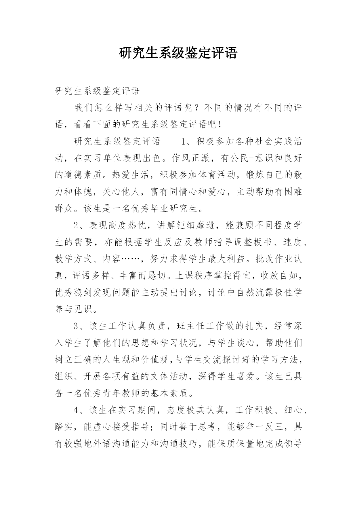 研究生系级鉴定评语研究生系级鉴定评语我们怎么样写相关的评语呢?不同的情况有不同的评语,看看下面的研究生系级鉴定评语吧!研究生系级鉴定评语1、积极参加各种社会实践活动,在实习单位表现出色。作风正派,有公民-意识和良好的道德素质。热爱生活,积极参加体育活动,锻炼自己的毅力和体魄,关心他人,富有同情心和爱心,主动帮助有困难群众。该生是一名优秀毕业研究生。2、表现高度热忱,讲解钜细靡遗,能兼顾不同程度学生的需要,亦能根据学生反应及教师指导调整板书、速度、教学方式、内容……,努力求得学生最大利益。批改作业认真,评语