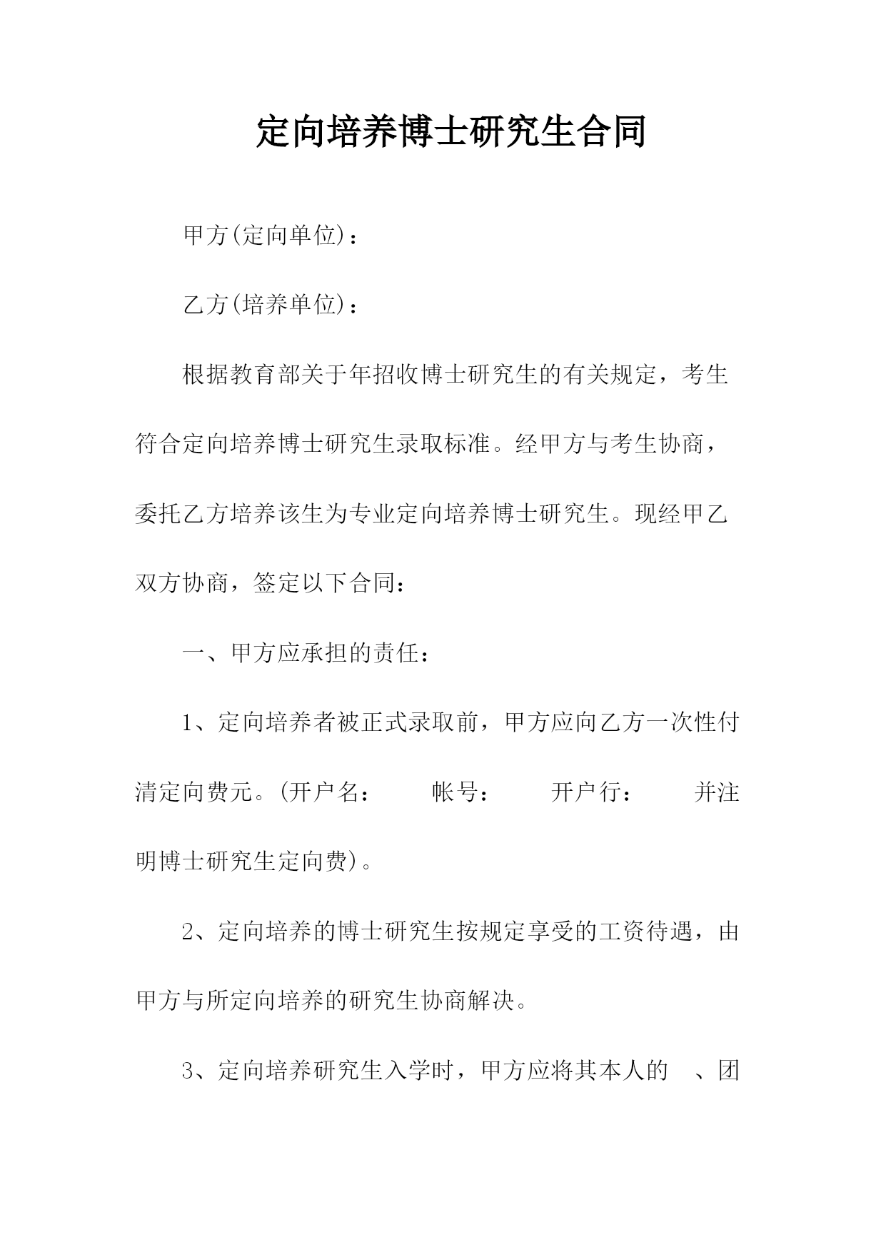 定向培养博士研究生合同甲方(定向单位):乙方(培养单位):根据教育部关于年招收博士研究生的有关规定,考生符合定向培养博士研究生录取标准。经甲方与考生协商,委托乙方培养该生为专业定向培养博士研究生。现经甲乙双方协商,签定以下合同:一、甲方应承担的责任:1、定向培养者被正式录取前,甲方应向乙方一次性付清定向费元。(开户名:帐号:开户行:并注明博士研究生定向费)。2、定向培养的博士研究生按规定享受的工资待遇,由甲方与所定向培养的研究生协商解决。3、定向培养研究生入学时,甲方应将其本人的、团组织关系转至乙方。4、