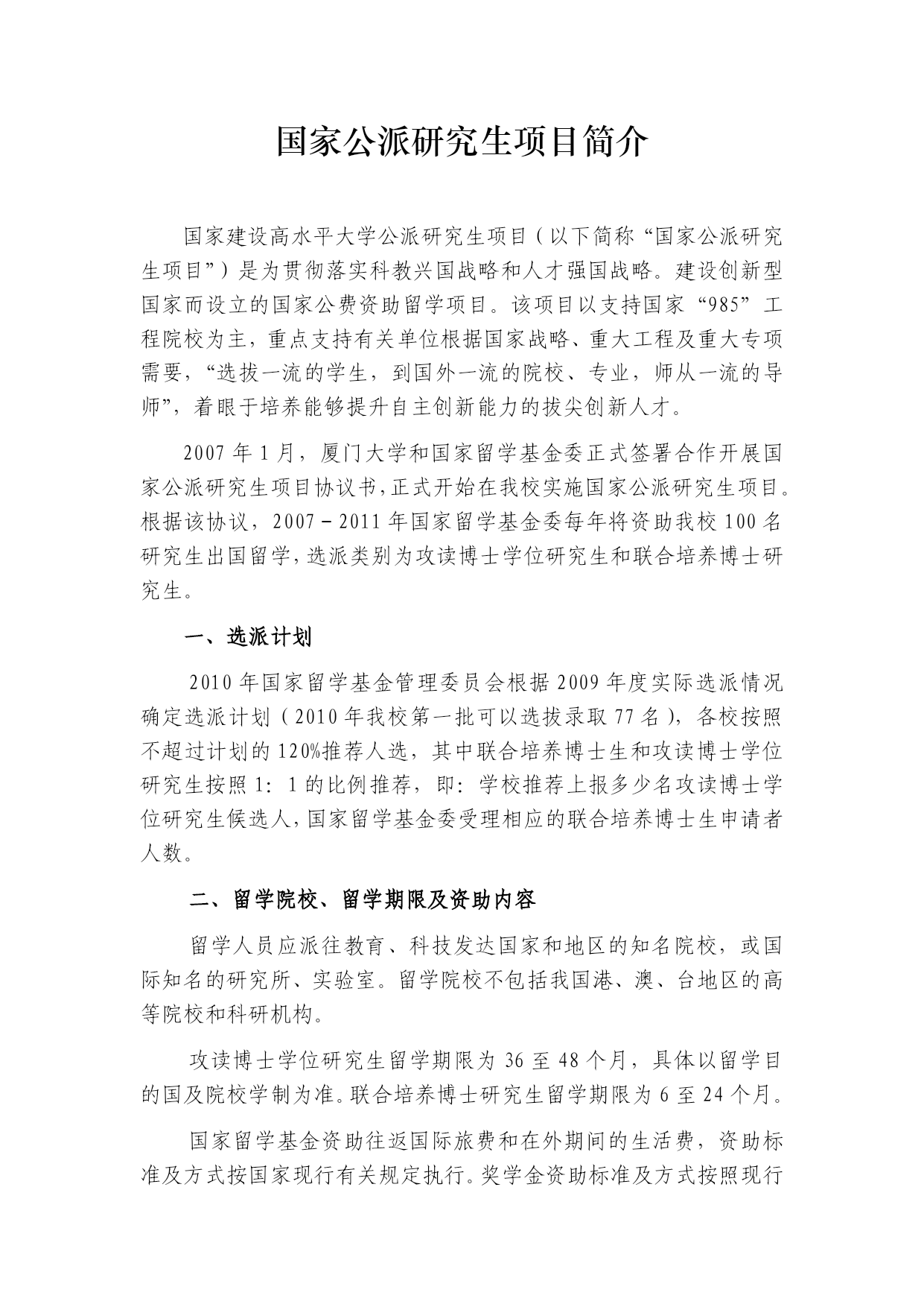 国家公派研究生项目简介国家建设高水平大学公派研究生项目(以下简称“国家公派研究生项目”)是为贯彻落实科教兴国战略和人才强国战略。建设创新型国家而设立的国家公费资助留学项目。该项目以支持国家“985”工程院校为主,重点支持有关单位根据国家战略、重大工程及重大专项需要,“选拔一流的学生,到国外一流的院校、专业,师从一流的导师”,着眼于培养能够提升自主创新能力的拔尖创新人才。2007年1月,厦门大学和国家留学基金委正式签署合作开展国家公派研究生项目协议书,正式开始在我校实施国家公派研究生项目。根据该协议,200