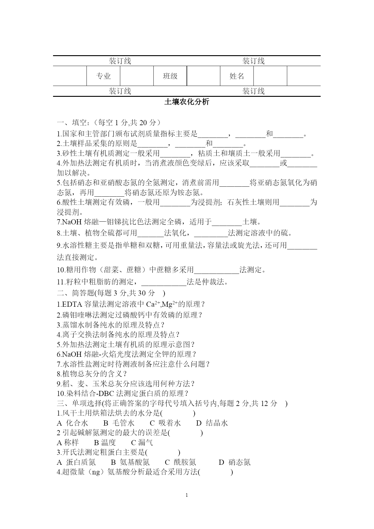 装订线装订线专业班级姓名装订线装订线土壤农化分析一、填空:(每空1分,共20分)1.国家和主管部门颁布试剂质量指标主要是________,________和________。2.土壤样品采集的原则是________,________和________。3.砂性土壤有机质测定一般采用________,粘质土和壤质土一般采用________。4.外加热法测定有机质时,当消煮液颜色变绿后,应该采取________或________加以解决。5.包括硝态和亚硝酸态氮的全氮测定,消煮前需用________将亚硝态氮