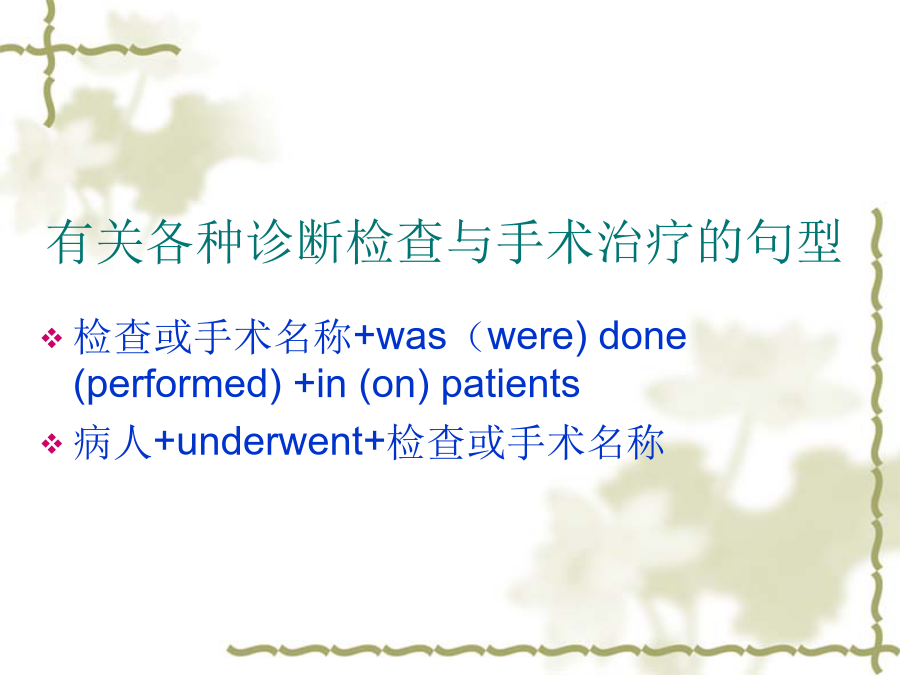 有关各种诊断检查与手术治疗的句型在第一个句型中,介词in与on可以互换Ultrasonographywasperformedon37patientswithprovencancerofthepancreas.作者对37例已被确诊为胰腺癌的患者作了超声显像检查。第二个句型例句Suchpatientsshouldundergocoronaryangiographyfordefectionofthedisease.这类患者应作冠状血管造影,以对该病进行诊断。练习我们对1393例患者作了直肠切除术(resecti