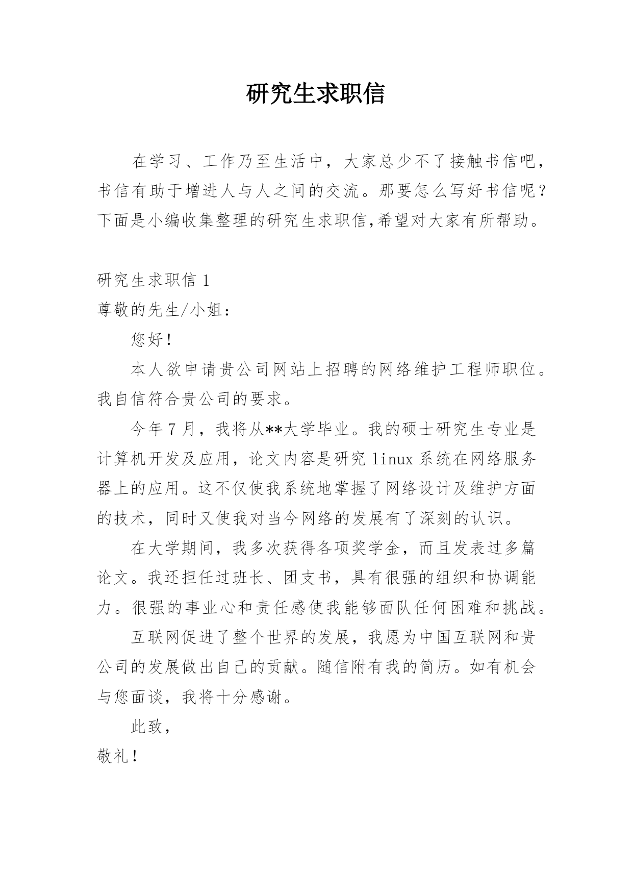 研究生求职信在学习、工作乃至生活中,大家总少不了接触书信吧,书信有助于增进人与人之间的交流。那要怎么写好书信呢?下面是小编收集整理的研究生求职信,希望对大家有所帮助。研究生求职信1尊敬的先生/小姐:您好!本人欲申请贵公司网站上招聘的网络维护工程师职位。我自信符合贵公司的要求。今年7月,我将从**大学毕业。我的硕士研究生专业是计算机开发及应用,论文内容是研究linux系统在网络服务器上的应用。这不仅使我系统地掌握了网络设计及维护方面的技术,同时又使我对当今网络的发展有了深刻的认识。在大学期间,我多次获得各项