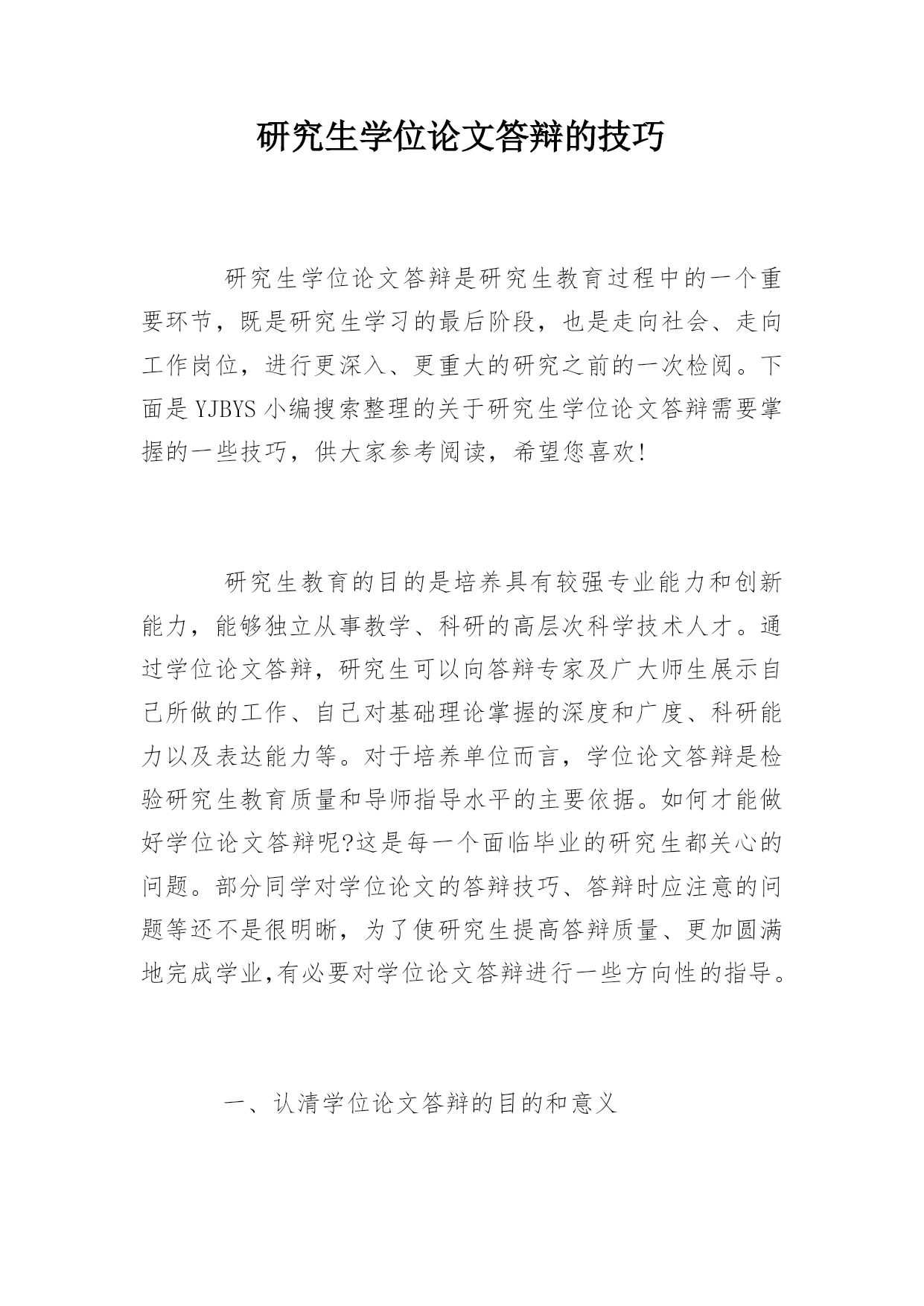 研究生学位论文答辩的技巧研究生学位论文答辩是研究生教育过程中的一个重要环节,既是研究生学习的最后阶段,也是走向社会、走向工作岗位,进行更深入、更重大的研究之前的一次检阅。下面是YJBYS小编搜索整理的关于研究生学位论文答辩需要掌握的一些技巧,供大家参考阅读,希望您喜欢!研究生教育的目的是培养具有较强专业能力和创新能力,能够独立从事教学、科研的高层次科学技术人才。通过学位论文答辩,研究生可以向答辩专家及广大师生展示自己所做的工作、自己对基础理论掌握的深度和广度、科研能力以及表达能力等。对于培养单位而言,学位