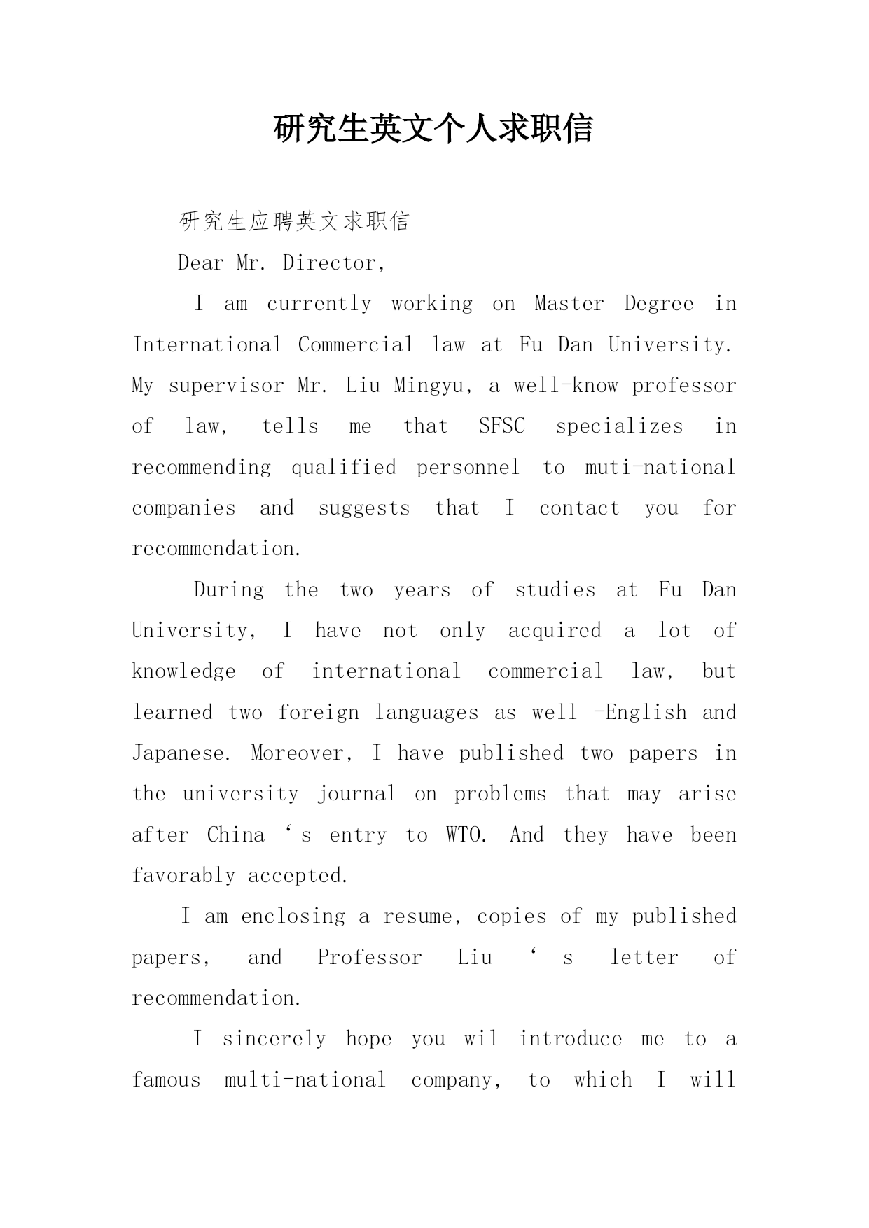 研究生英文个人求职信研究生应聘英文求职信DearMr.Director,IamcurrentlyworkingonMasterDegreeinInternationalCommerciallawatFuDanUniversity.MysupervisorMr.LiuMingyu,awell-knowprofessoroflaw,tellsmethatSFSCspecializesinrecommendingqualifiedpersonneltomuti-nationalcompaniesandsugge