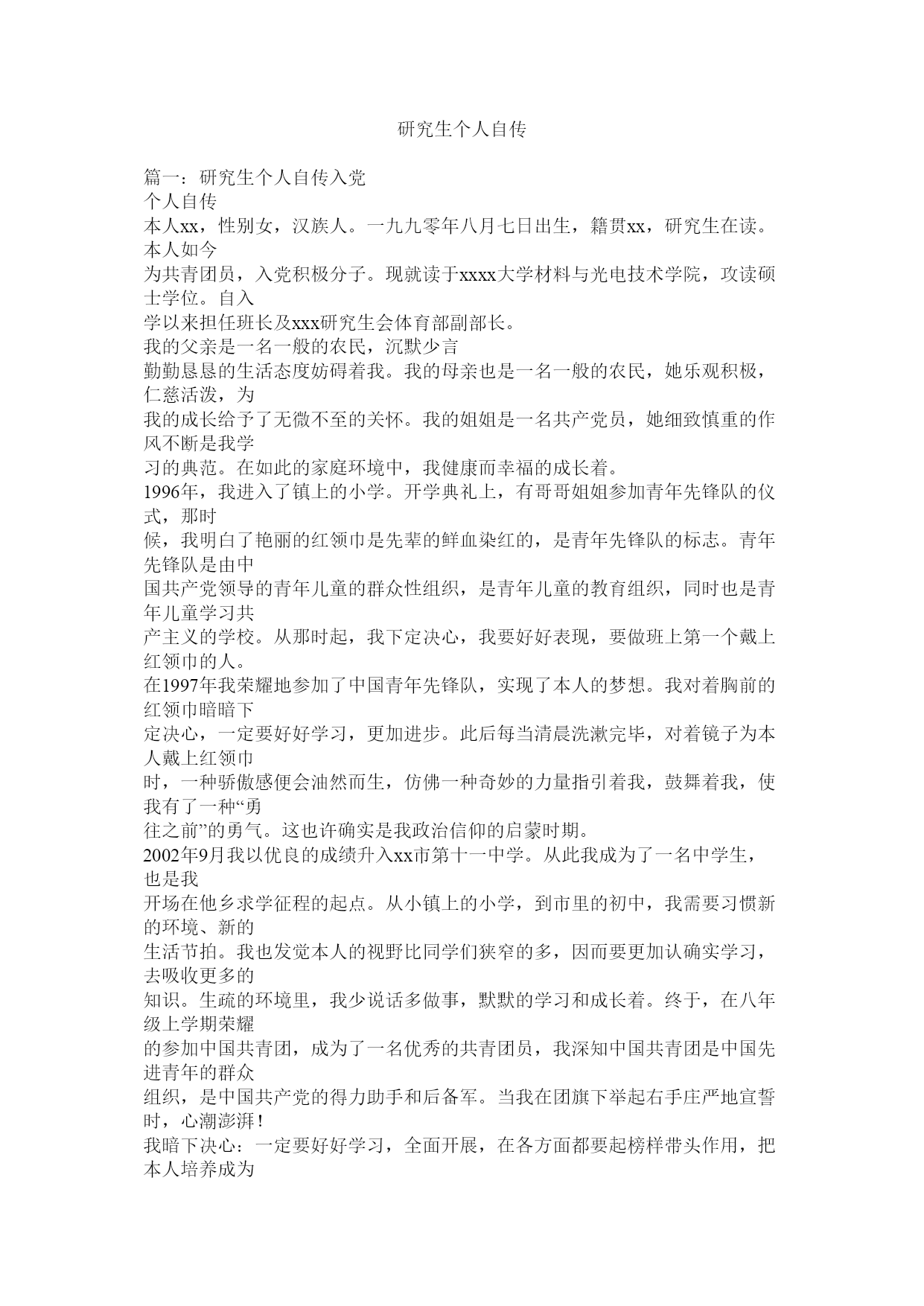 研究生个人自传篇一:研究生个人自传入党个人自传本人xx,性别女,汉族人。一九九零年八月七日出生,籍贯xx,研究生在读。本人如今为共青团员,入党积极分子。现就读于xxxx大学材料与光电技术学院,攻读硕士学位。自入学以来担任班长及xxx研究生会体育部副部长。我的父亲是一名一般的农民,沉默少言勤勤恳恳的生活态度妨碍着我。我的母亲也是一名一般的农民,她乐观积极,仁慈活泼,为我的成长给予了无微不至的关怀。我的姐姐是一名共产党员,她细致慎重的作风不断是我学习的典范。在如此的家庭环境中,我健康而幸福的成长着。1996年