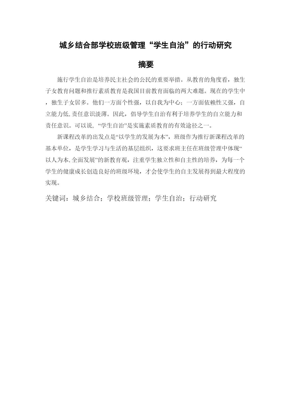 城乡结合部学校班级管理“学生自治”的行动研究摘要施行学生自治是培养民主社会的公民的重要举措。从教育的角度看,独生子女教育问题和推行素质教育是我国目前教育面临的两大难题。现在的学生中,独生子女居多。他们一方面个性强,以自我为中心;一方面依赖性又强,自立能力低,责任意识淡薄。因此,倡导学生自治有利于培养学生的自立能力和责任意识。可以说,“学生自治”是实施素质教育的有效途径之一。新课程改革的出发点是“以学生的发展为本”,班级作为推行新课程改革的基本单位,是学生学习与生活的基层组织,这要求班主任在班级管理中体现“