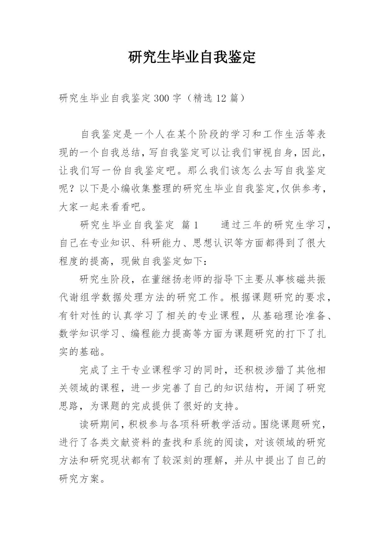 研究生毕业自我鉴定研究生毕业自我鉴定300字(精选12篇)自我鉴定是一个人在某个阶段的学习和工作生活等表现的一个自我总结,写自我鉴定可以让我们审视自身,因此,让我们写一份自我鉴定吧。那么我们该怎么去写自我鉴定呢?以下是小编收集整理的研究生毕业自我鉴定,仅供参考,大家一起来看看吧。研究生毕业自我鉴定篇1通过三年的研究生学习,自己在专业知识、科研能力、思想认识等方面都得到了很大程度的提高,现做自我鉴定如下:研究生阶段,在董继扬老师的指导下主要从事核磁共振代谢组学数据处理方法的研究工作。根据课题研究的要求,有针