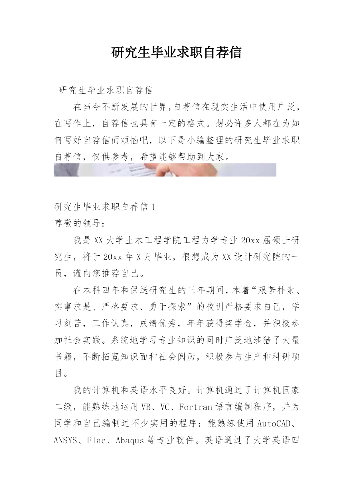 研究生毕业求职自荐信研究生毕业求职自荐信在当今不断发展的世界,自荐信在现实生活中使用广泛,在写作上,自荐信也具有一定的格式。想必许多人都在为如何写好自荐信而烦恼吧,以下是小编整理的研究生毕业求职自荐信,仅供参考,希望能够帮助到大家。研究生毕业求职自荐信1尊敬的领导:我是XX大学土木工程学院工程力学专业20xx届硕士研究生,将于20xx年X月毕业,很想成为XX设计研究院的一员,谨向您推荐自己。在本科四年和保送研究生的三年期间,本着“艰苦朴素、实事求是、严格要求、勇于探索”的校训严格要求自己,学习刻苦,工作认
