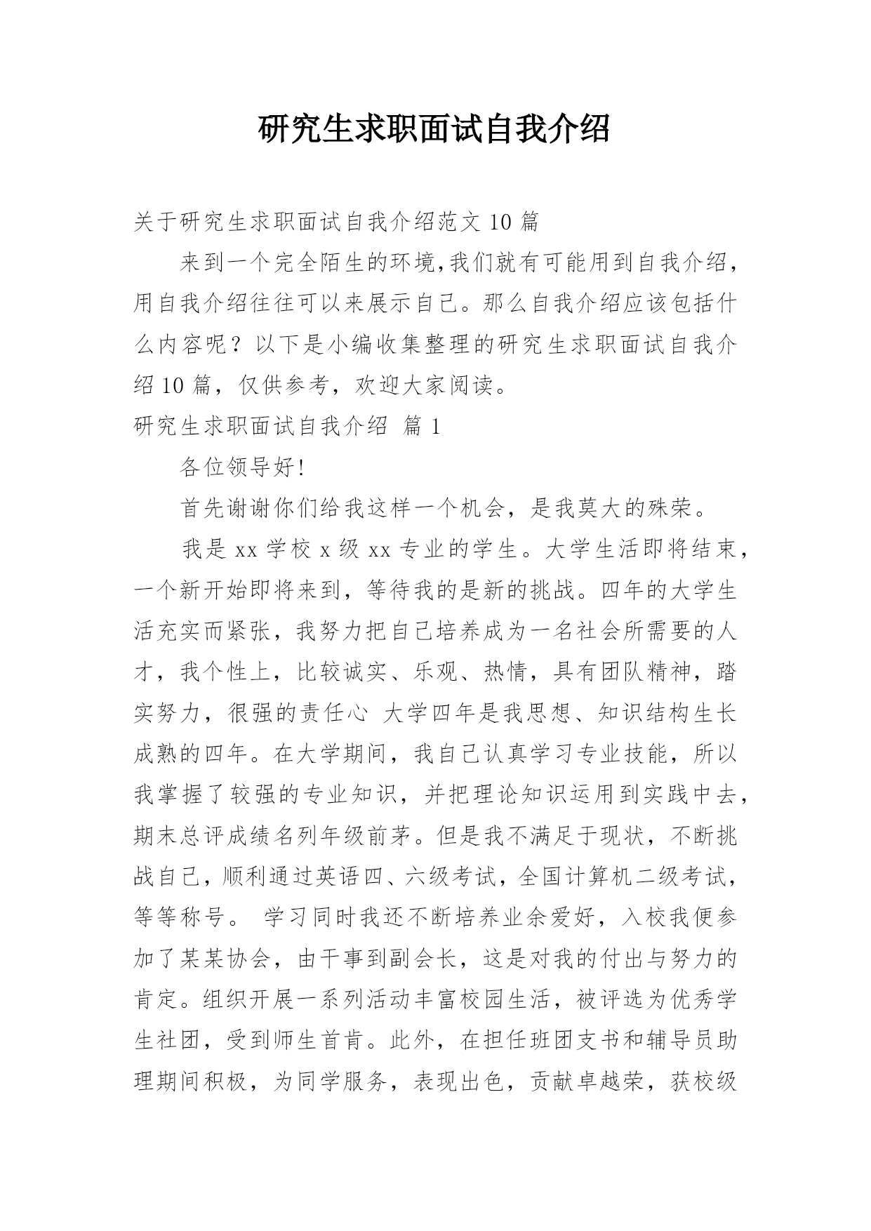 研究生求职面试自我介绍关于研究生求职面试自我介绍范文10篇来到一个完全陌生的环境,我们就有可能用到自我介绍,用自我介绍往往可以来展示自己。那么自我介绍应该包括什么内容呢?以下是小编收集整理的研究生求职面试自我介绍10篇,仅供参考,欢迎大家阅读。研究生求职面试自我介绍篇1各位领导好!首先谢谢你们给我这样一个机会,是我莫大的殊荣。我是xx学校x级xx专业的学生。大学生活即将结束,一个新开始即将来到,等待我的是新的挑战。四年的大学生活充实而紧张,我努力把自己培养成为一名社会所需要的人才,我个性上,比较诚实、乐观