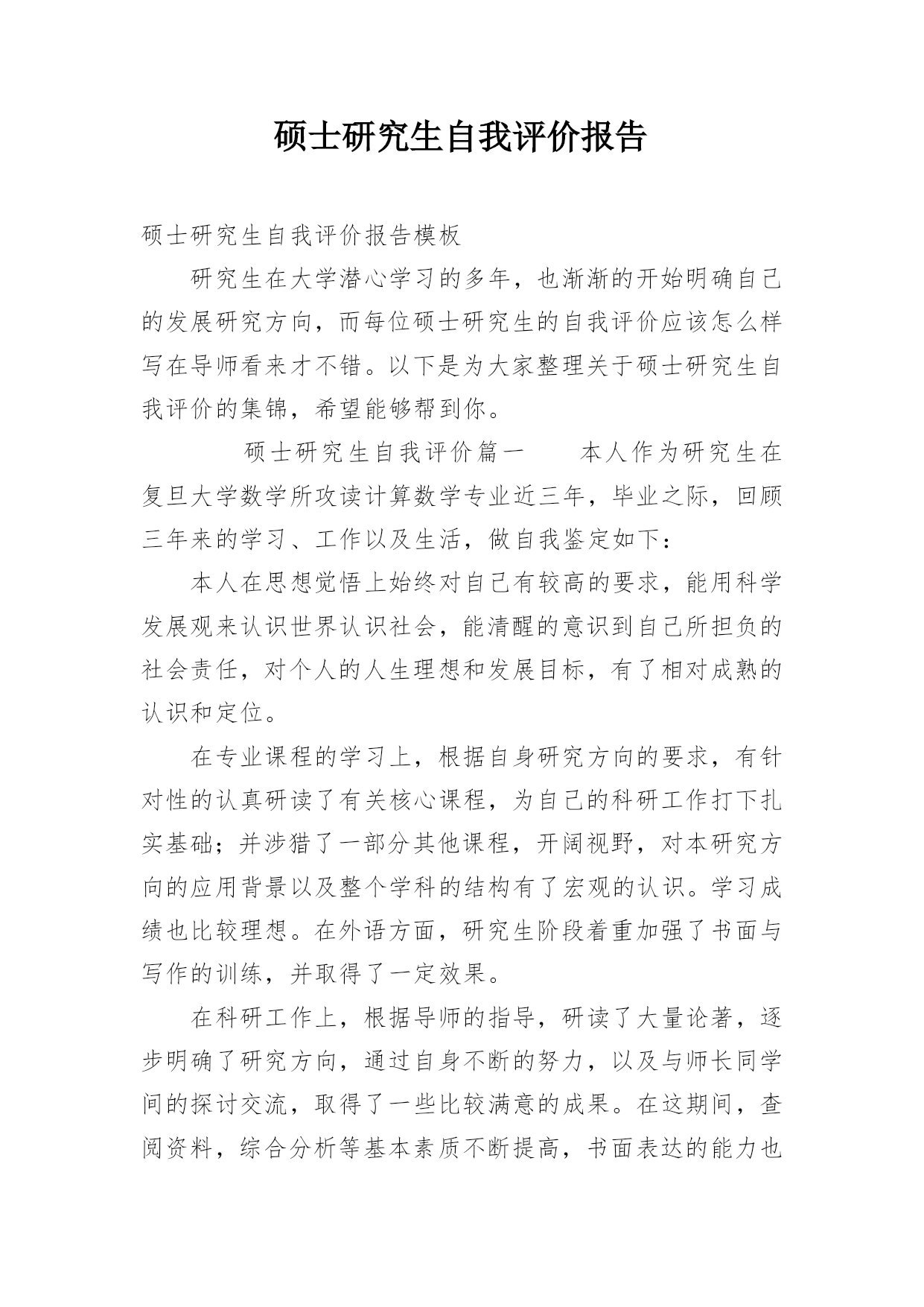 硕士研究生自我评价报告硕士研究生自我评价报告模板研究生在大学潜心学习的多年,也渐渐的开始明确自己的发展研究方向,而每位硕士研究生的自我评价应该怎么样写在导师看来才不错。以下是为大家整理关于硕士研究生自我评价的集锦,希望能够帮到你。硕士研究生自我评价篇一本人作为研究生在复旦大学数学所攻读计算数学专业近三年,毕业之际,回顾三年来的学习、工作以及生活,做自我鉴定如下:本人在思想觉悟上始终对自己有较高的要求,能用科学发展观来认识世界认识社会,能清醒的意识到自己所担负的社会责任,对个人的人生理想和发展目标,有了相对