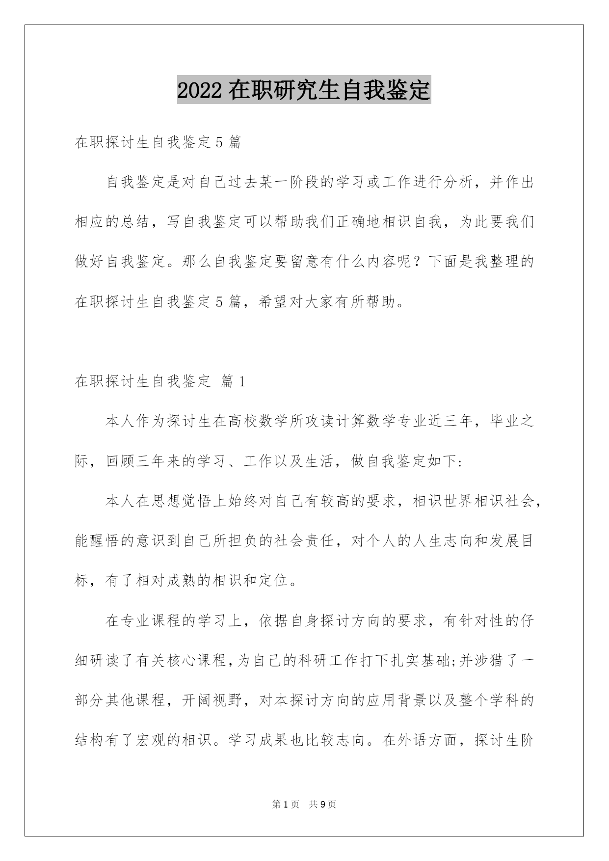 2022研究生自我鉴定范文2022研究生自我鉴定范文1本人进入研究生阶段以来,我一直以自勤、自勉、自强、自重来要求自己。在之前考取研究生之时,我就意识到,其实在追求知识的路上,并不是只为了一个结果,而是为了找到一个关于我们每个人一生的真理。在学习上,我保持一个非常明确的态度,那就是不断去完善自我。已经进入研究生阶段了,我不再是曾经的那个小孩,也不是大学的那个懵懂青年了,我的身上承载了更多的东西,也需要去创造更多的东西。研究生,这三个字听起来让人崇拜和向往,但是想要真正做好这三个字是何其难呢?这几年,我一直