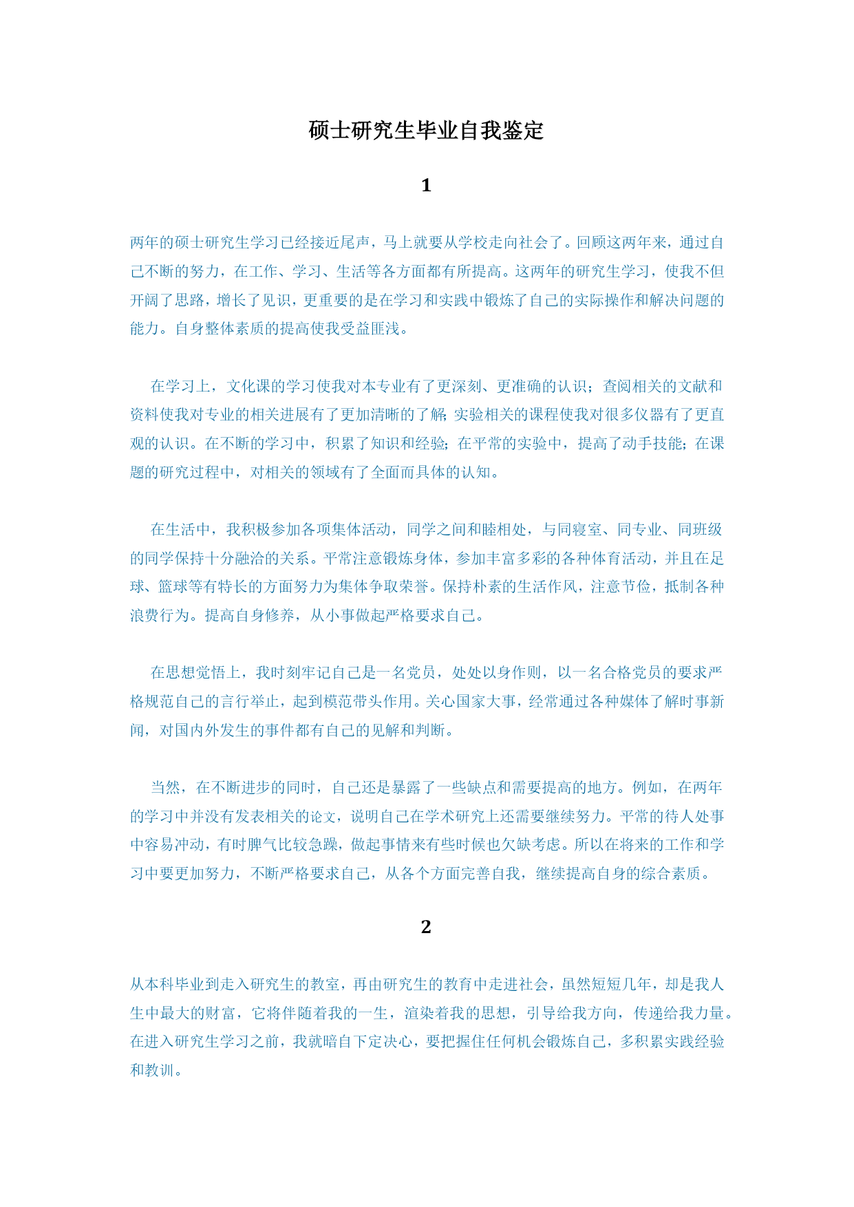 硕士研究生毕业自我鉴定1两年的硕士研究生学习已经接近尾声,马上就要从学校走向社会了。回顾这两年来,通过自己不断的努力,在工作、学习、生活等各方面都有所提高。这两年的研究生学习,使我不但开阔了思路,增长了见识,更重要的是在学习和实践中锻炼了自己的实际操作和解决问题的能力。自身整体素质的提高使我受益匪浅。在学习上,文化课的学习使我对本专业有了更深刻、更准确的认识;查阅相关的文献和资料使我对专业的相关进展有了更加清晰的了解;实验相关的课程使我对很多仪器有了更直观的认识。在不断的学习中,积累了知识和经验;在平常的