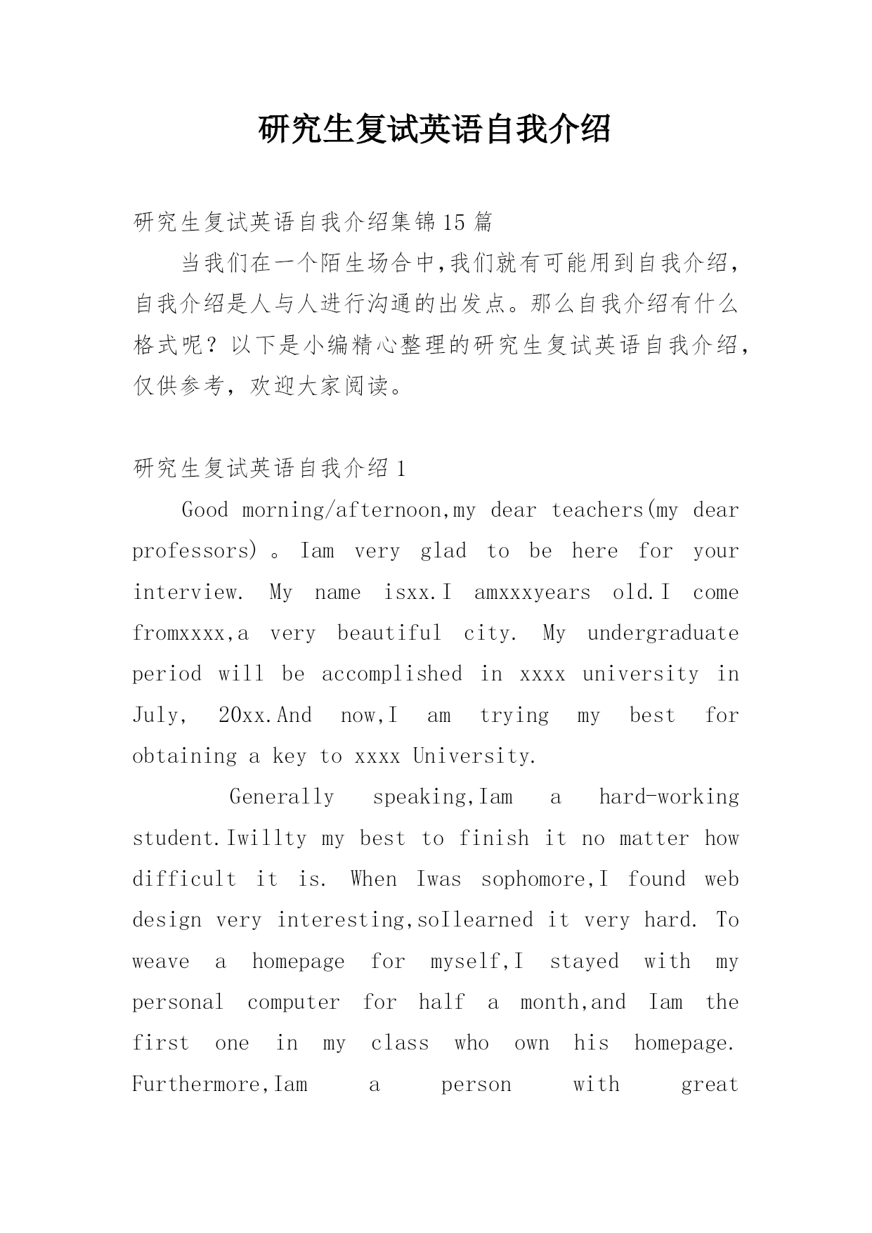 研究生复试英语自我介绍研究生复试英语自我介绍集锦15篇当我们在一个陌生场合中,我们就有可能用到自我介绍,自我介绍是人与人进行沟通的出发点。那么自我介绍有什么格式呢?以下是小编精心整理的研究生复试英语自我介绍,仅供参考,欢迎大家阅读。研究生复试英语自我介绍1Goodmorning/afternoon,mydearteachers(mydearprofessors)。Iamverygladtobehereforyourinterview.Mynameisxx.Iamxxxyearsold.Icomefromx