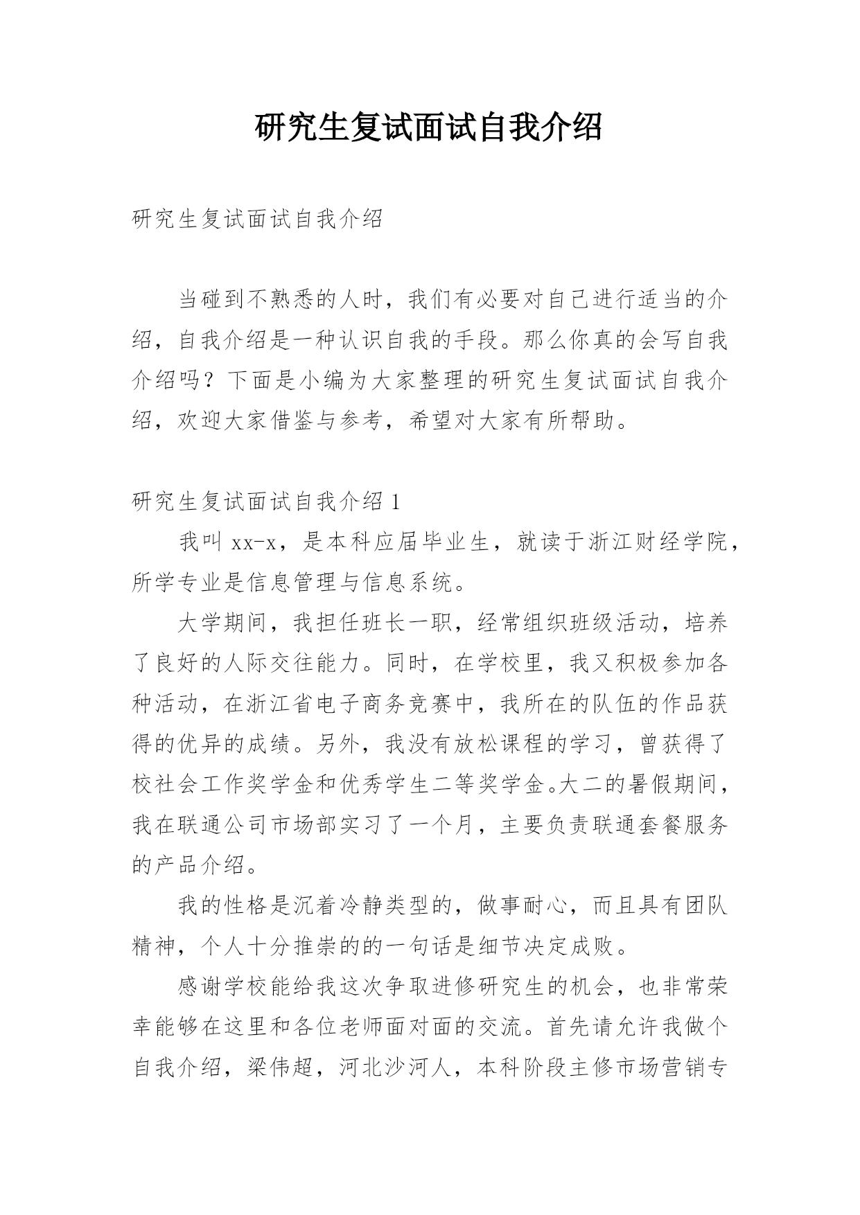 研究生复试面试自我介绍研究生复试面试自我介绍当碰到不熟悉的人时,我们有必要对自己进行适当的介绍,自我介绍是一种认识自我的手段。那么你真的会写自我介绍吗?下面是小编为大家整理的研究生复试面试自我介绍,欢迎大家借鉴与参考,希望对大家有所帮助。研究生复试面试自我介绍1我叫xx-x,是本科应届毕业生,就读于浙江财经学院,所学专业是信息管理与信息系统。大学期间,我担任班长一职,经常组织班级活动,培养了良好的人际交往能力。同时,在学校里,我又积极参加各种活动,在浙江省电子商务竞赛中,我所在的队伍的作品获得的优异的成绩