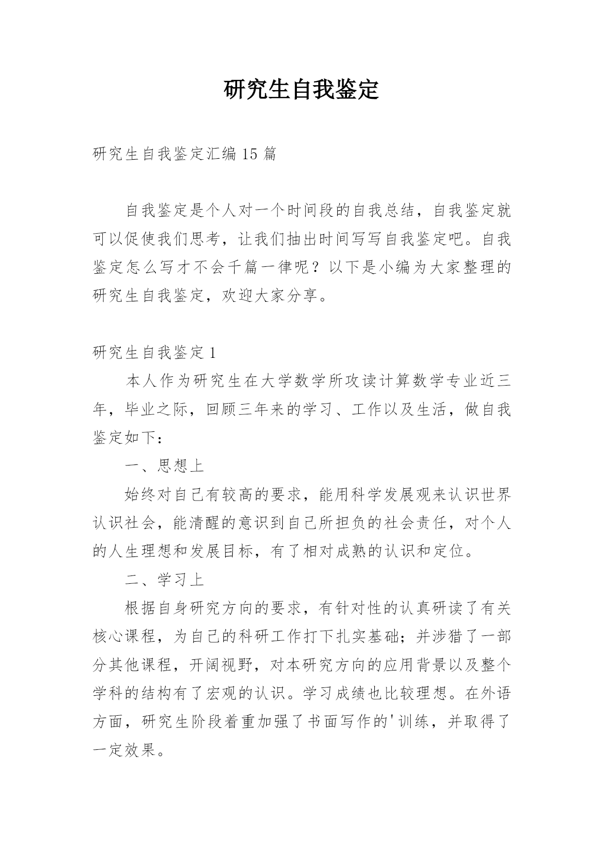 研究生自我鉴定研究生自我鉴定汇编15篇自我鉴定是个人对一个时间段的自我总结,自我鉴定就可以促使我们思考,让我们抽出时间写写自我鉴定吧。自我鉴定怎么写才不会千篇一律呢?以下是小编为大家整理的研究生自我鉴定,欢迎大家分享。研究生自我鉴定1本人作为研究生在大学数学所攻读计算数学专业近三年,毕业之际,回顾三年来的学习、工作以及生活,做自我鉴定如下:一、思想上始终对自己有较高的要求,能用科学发展观来认识世界认识社会,能清醒的意识到自己所担负的社会责任,对个人的人生理想和发展目标,有了相对成熟的认识和定位。二、学习上