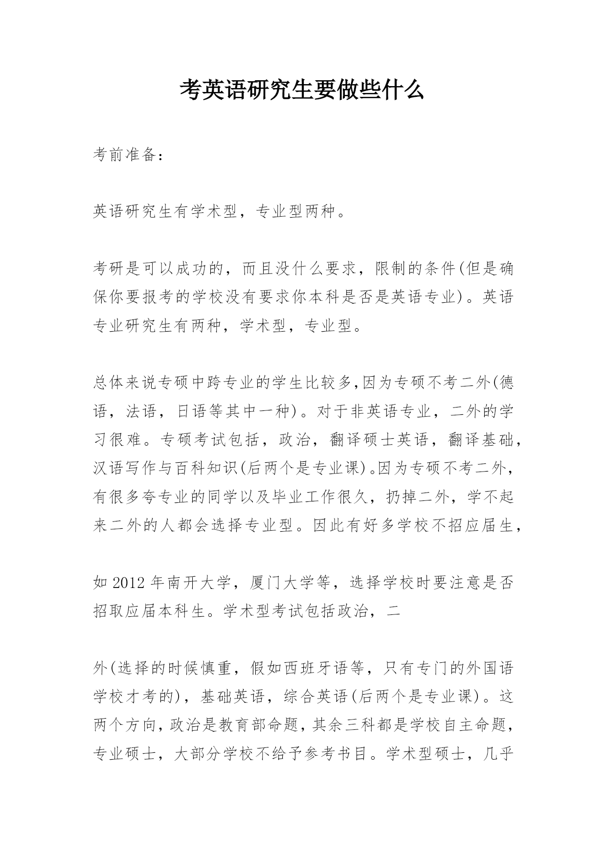 考英语研究生要做些什么考前准备:英语研究生有学术型,专业型两种。考研是可以成功的,而且没什么要求,限制的条件(但是确保你要报考的学校没有要求你本科是否是英语专业)。英语专业研究生有两种,学术型,专业型。总体来说专硕中跨专业的学生比较多,因为专硕不考二外(德语,法语,日语等其中一种)。对于非英语专业,二外的学习很难。专硕考试包括,政治,翻译硕士英语,翻译基础,汉语写作与百科知识(后两个是专业课)。因为专硕不考二外,有很多夸专业的同学以及毕业工作很久,扔掉二外,学不起来二外的人都会选择专业型。因此有好多学校不