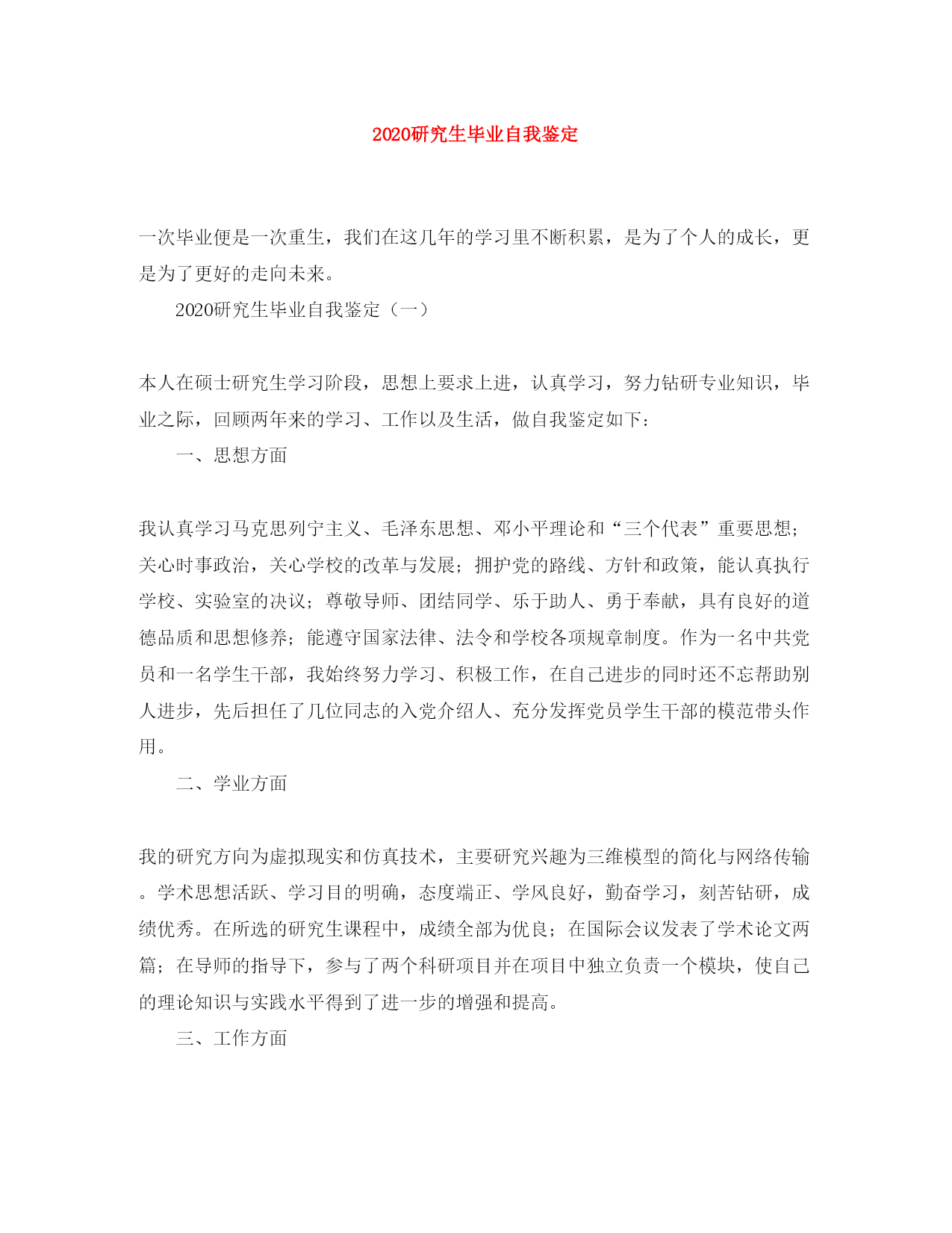 此资料由网络收集而来,如有侵权请告知上传者立即删除。资料共分享,我们负责传递知识。2020研究生毕业自我鉴定一次毕业便是一次重生,我们在这几年的学习里不断积累,是为了个人的成长,更是为了更好的走向未来。2020研究生毕业自我鉴定(一)本人在硕士研究生学习阶段,思想上要求上进,认真学习,努力钻研专业知识,毕业之际,回顾两年来的学习、工作以及生活,做自我鉴定如下:一、思想方面我认真学习马克思列宁主义、毛泽东思想、邓小平理论和“三个代表”重要思想;关心时事政治,关心学校的改革与发展;拥护党的路线、方针和政策,能