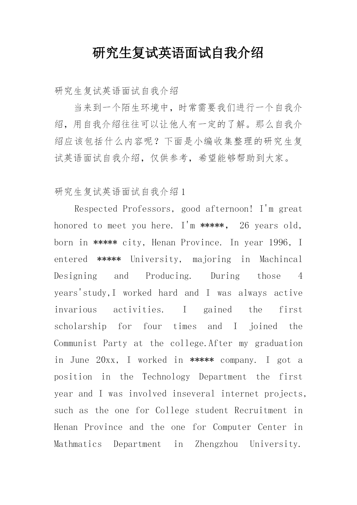 研究生复试英语面试自我介绍研究生复试英语面试自我介绍当来到一个陌生环境中,时常需要我们进行一个自我介绍,用自我介绍往往可以让他人有一定的了解。那么自我介绍应该包括什么内容呢?下面是小编收集整理的研究生复试英语面试自我介绍,仅供参考,希望能够帮助到大家。研究生复试英语面试自我介绍1RespectedProfessors,goodafternoon!I'mgreathonoredtomeetyouhere.I'm*****,26yearsold,bornin*****city,HenanProvince.In