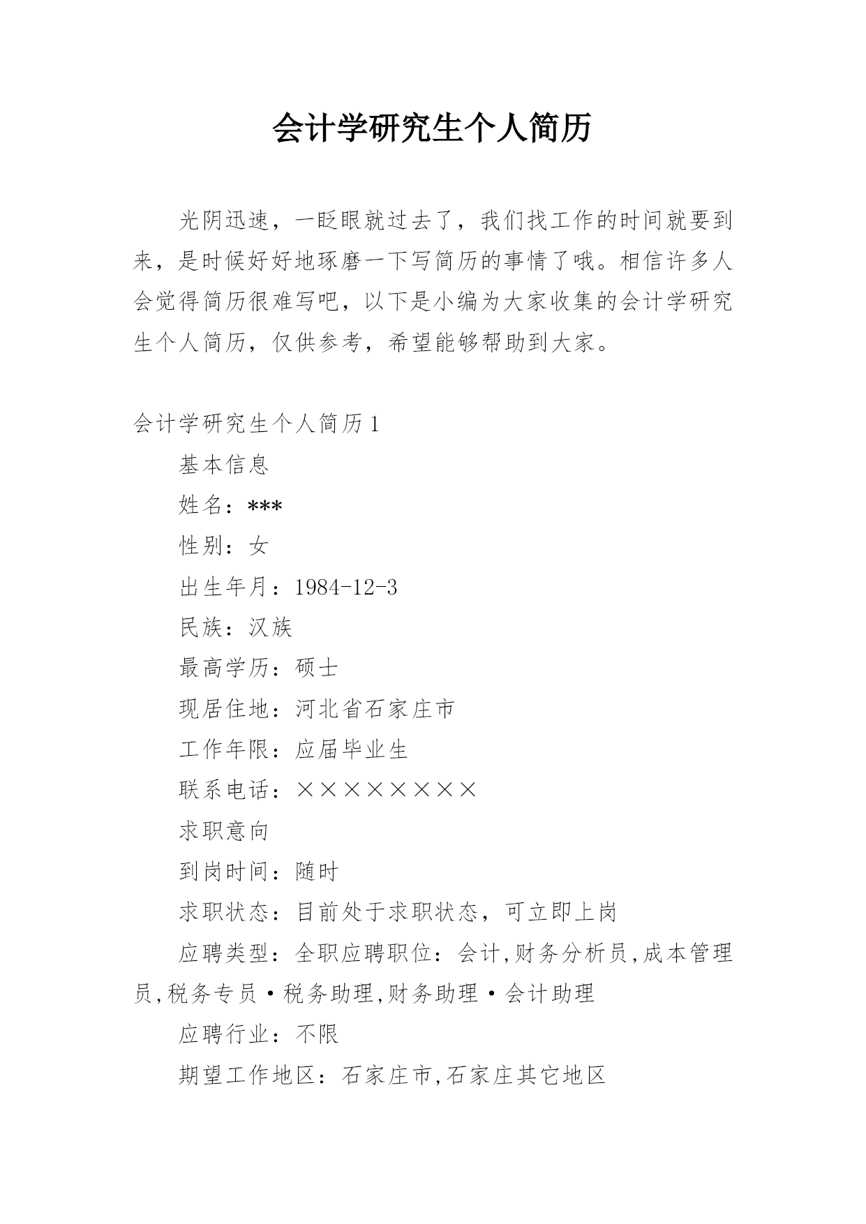 会计学研究生个人简历光阴迅速,一眨眼就过去了,我们找工作的时间就要到来,是时候好好地琢磨一下写简历的事情了哦。相信许多人会觉得简历很难写吧,以下是小编为大家收集的会计学研究生个人简历,仅供参考,希望能够帮助到大家。会计学研究生个人简历1基本信息姓名:***性别:女出生年月:1984-12-3民族:汉族最高学历:硕士现居住地:河北省石家庄市工作年限:应届毕业生联系电话:××××××××求职意向到岗时间:随时求职状态:目前处于求职状态,可立即上岗应聘类型:全职应聘职位:会计,财务分析员,成本管理员,税务专员·