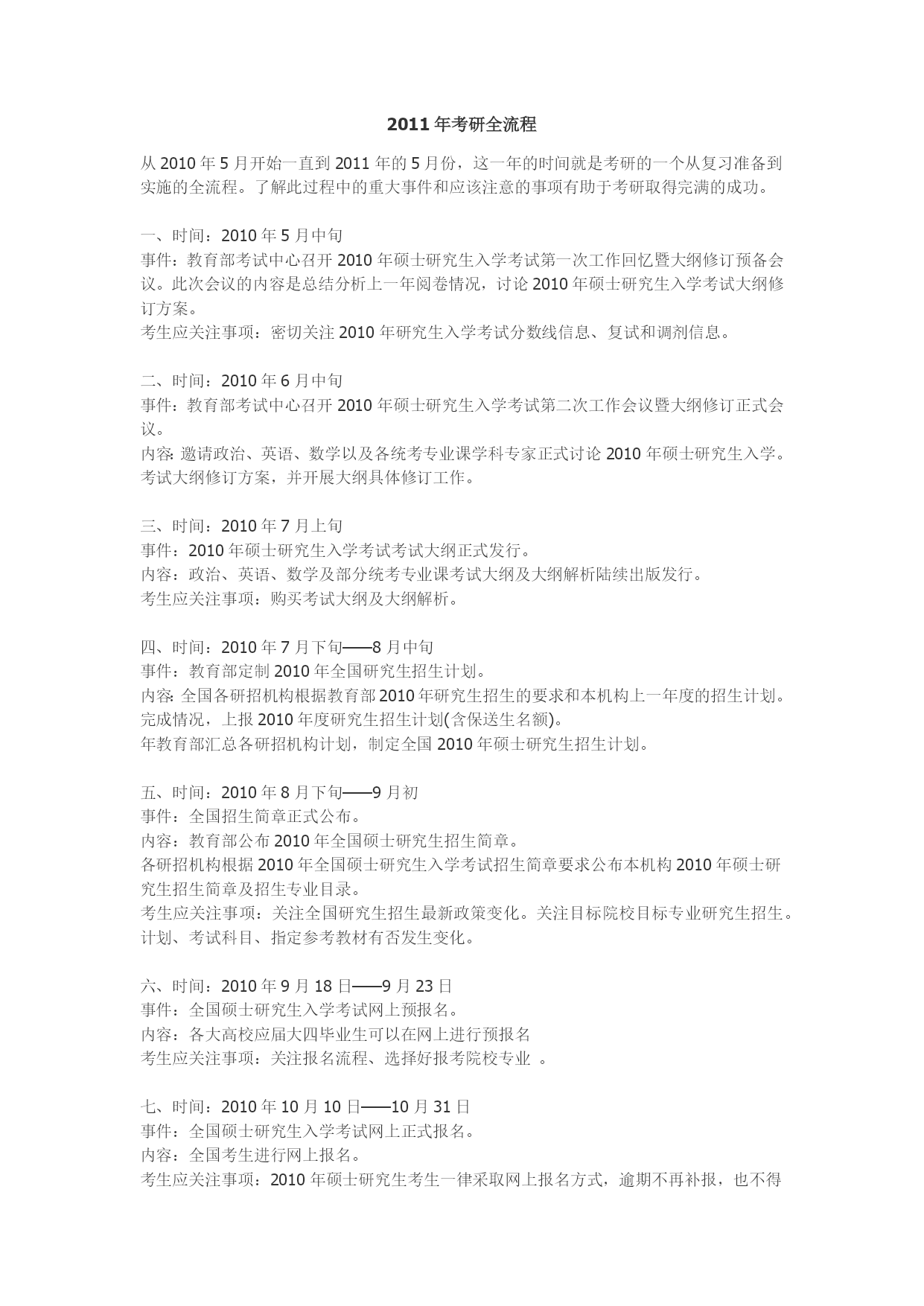 2011年考研全流程从2010年5月开始一直到2011年的5月份,这一年的时间就是考研的一个从复习准备到实施的全流程。了解此过程中的重大事件和应该注意的事项有助于考研取得完满的成功。一、时间:2010年5月中旬事件:教育部考试中心召开2010年硕士研究生入学考试第一次工作回忆暨大纲修订预备会议。此次会议的内容是总结分析上一年阅卷情况,讨论2010年硕士研究生入学考试大纲修订方案。考生应关注事项:密切关注2010年研究生入学考试分数线信息、复试和调剂信息。二、时间:2010年6月中旬事件:教育部考试中心召开