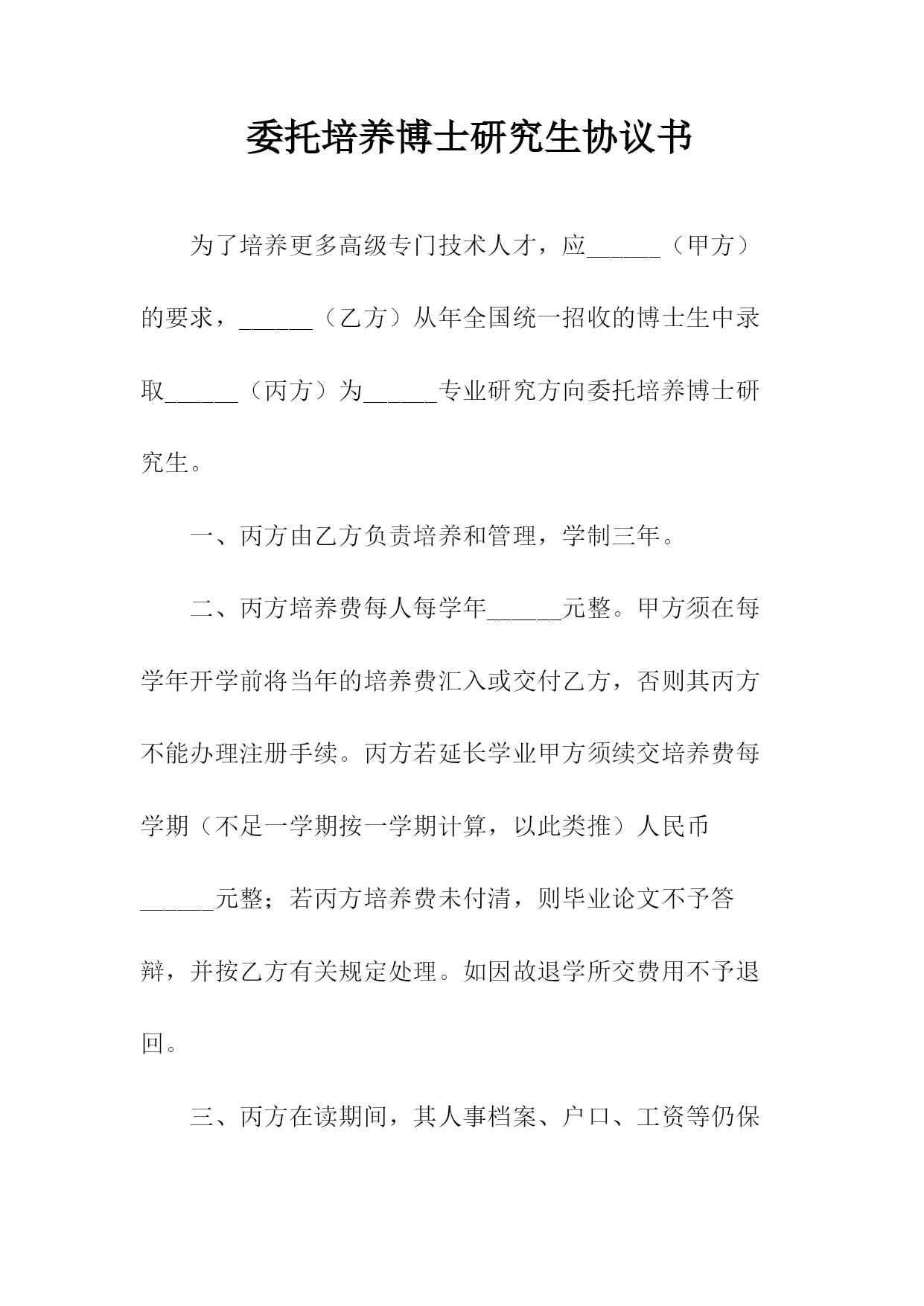 委托培养博士研究生协议书为了培养更多高级专门技术人才,应______(甲方)的要求,______(乙方)从年全国统一招收的博士生中录取______(丙方)为______专业研究方向委托培养博士研究生。一、丙方由乙方负责培养和管理,学制三年。二、丙方培养费每人每学年______元整。甲方须在每学年开学前将当年的培养费汇入或交付乙方,否则其丙方不能办理注册手续。丙方若延长学业甲方须续交培养费每学期(不足一学期按一学期计算,以此类推)人民币______元整;若丙方培养费未付清,则毕业论文不予答辩,并按乙方有关规