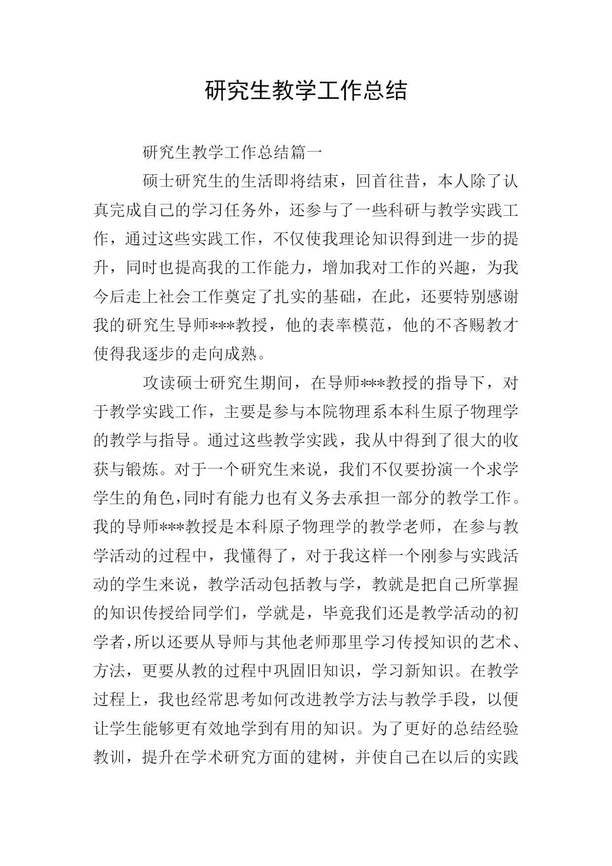 研究生教学工作总结研究生教学工作总结篇一硕士研究生的生活即将结束,回首往昔,本人除了认真完成自己的学习任务外,还参与了一些科研与教学实践工作,通过这些实践工作,不仅使我理论知识得到进一步的提升,同时也提高我的工作能力,增加我对工作的兴趣,为我今后走上社会工作奠定了扎实的基础,在此,还要特别感谢我的研究生导师***教授,他的表率模范,他的不吝赐教才使得我逐步的走向成熟。攻读硕士研究生期间,在导师***教授的指导下,对于教学实践工作,主要是参与本院物理系本科生原子物理学的教学与指导。通过这些教学实践,我从中得