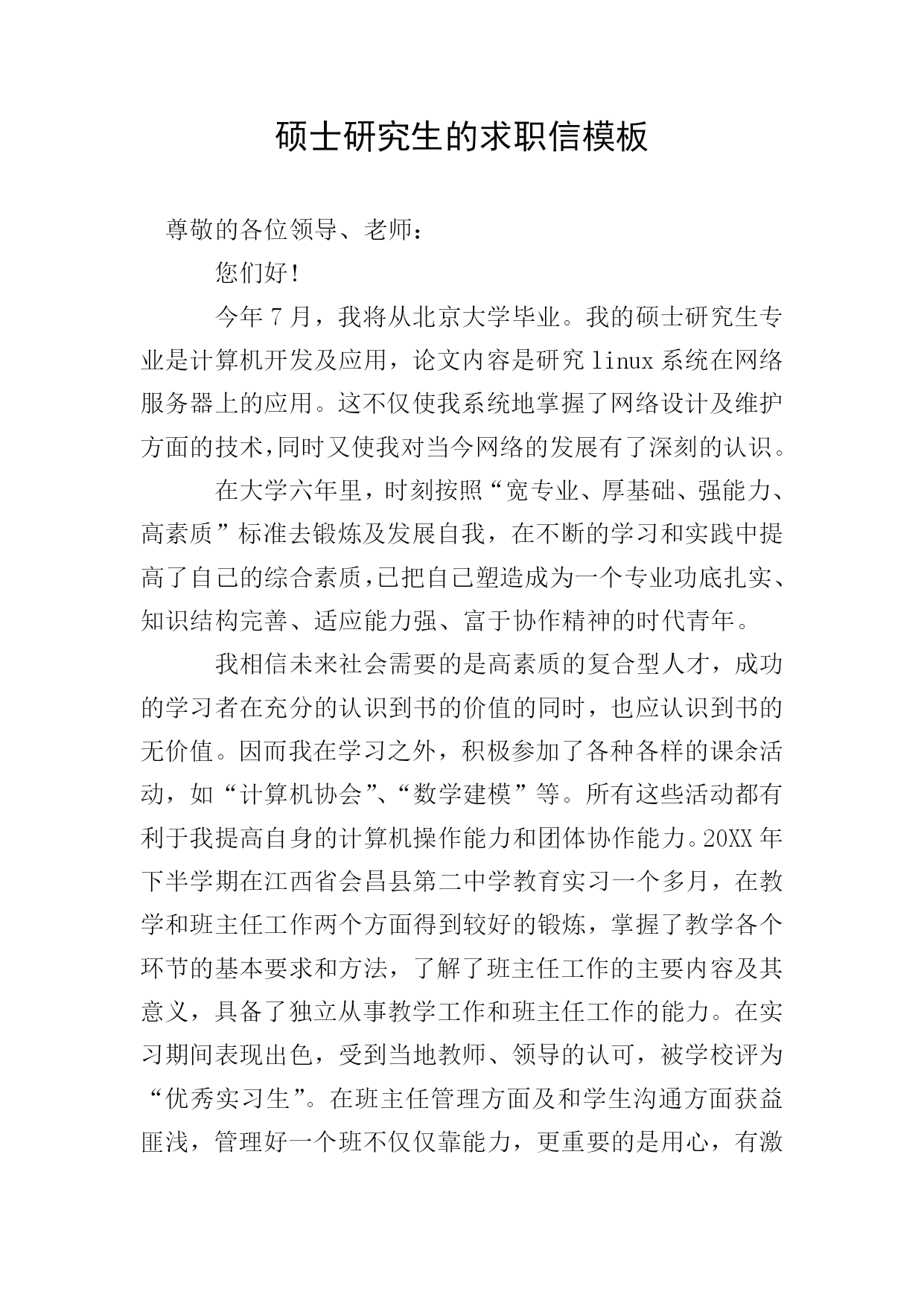 硕士研究生的求职信模板尊敬的各位领导、老师:您们好!今年7月,我将从北京大学毕业。我的硕士研究生专业是计算机开发及应用,论文内容是研究linux系统在网络服务器上的应用。这不仅使我系统地掌握了网络设计及维护方面的技术,同时又使我对当今网络的发展有了深刻的认识。在大学六年里,时刻按照“宽专业、厚基础、强能力、高素质”标准去锻炼及发展自我,在不断的学习和实践中提高了自己的综合素质,已把自己塑造成为一个专业功底扎实、知识结构完善、适应能力强、富于协作精神的时代青年。我相信未来社会需要的是高素质的复合型人才,成功