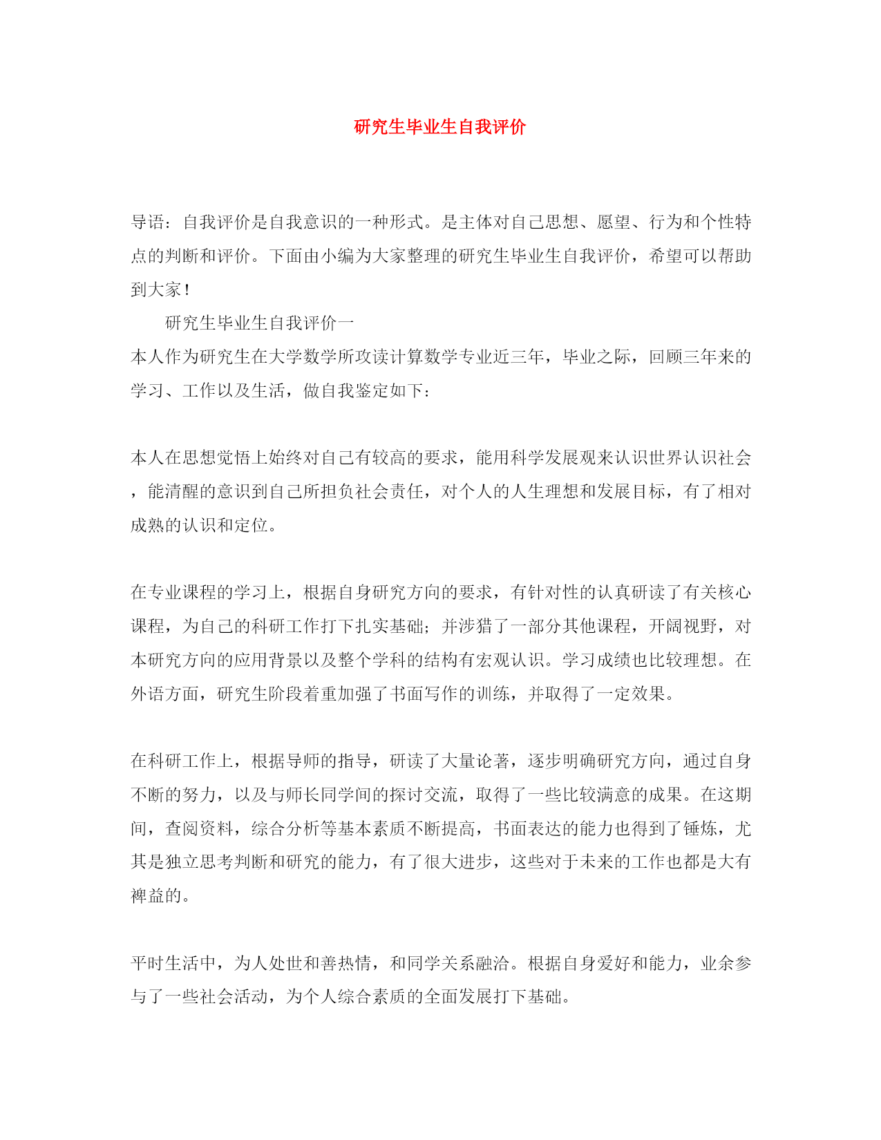 此资料由网络收集而来,如有侵权请告知上传者立即删除。资料共分享,我们负责传递知识。研究生毕业生自我评价导语:自我评价是自我意识的一种形式。是主体对自己思想、愿望、行为和个性特点的判断和评价。下面由小编为大家整理的研究生毕业生自我评价,希望可以帮助到大家!研究生毕业生自我评价一本人作为研究生在大学数学所攻读计算数学专业近三年,毕业之际,回顾三年来的学习、工作以及生活,做自我鉴定如下:本人在思想觉悟上始终对自己有较高的要求,能用科学发展观来认识世界认识社会,能清醒的意识到自己所担负社会责任,对个人的人生理想和