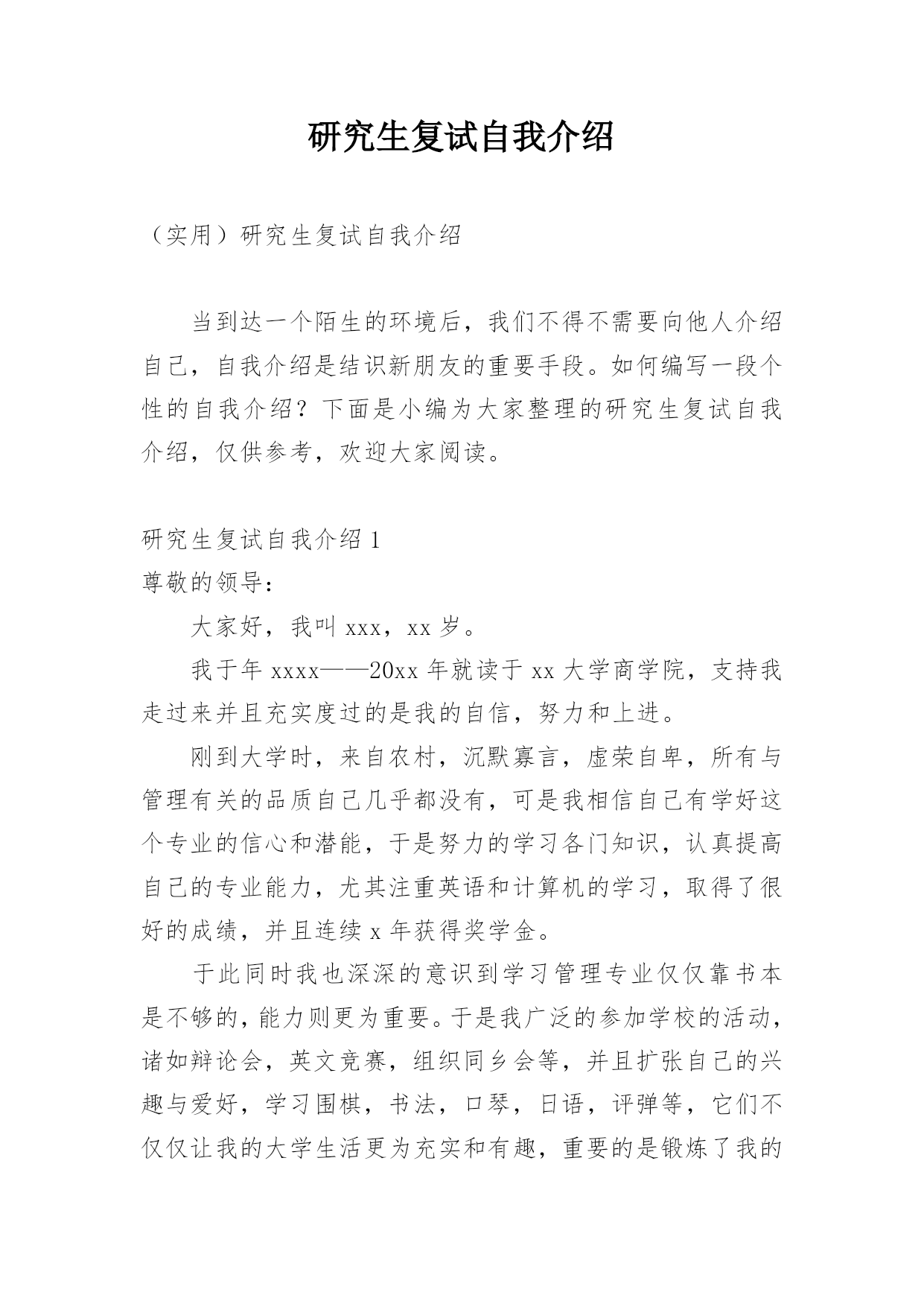 研究生复试自我介绍(实用)研究生复试自我介绍当到达一个陌生的环境后,我们不得不需要向他人介绍自己,自我介绍是结识新朋友的重要手段。如何编写一段个性的自我介绍?下面是小编为大家整理的研究生复试自我介绍,仅供参考,欢迎大家阅读。研究生复试自我介绍1尊敬的领导:大家好,我叫xxx,xx岁。我于年xxxx——20xx年就读于xx大学商学院,支持我走过来并且充实度过的是我的自信,努力和上进。刚到大学时,来自农村,沉默寡言,虚荣自卑,所有与管理有关的品质自己几乎都没有,可是我相信自己有学好这个专业的信心和潜能,于是努