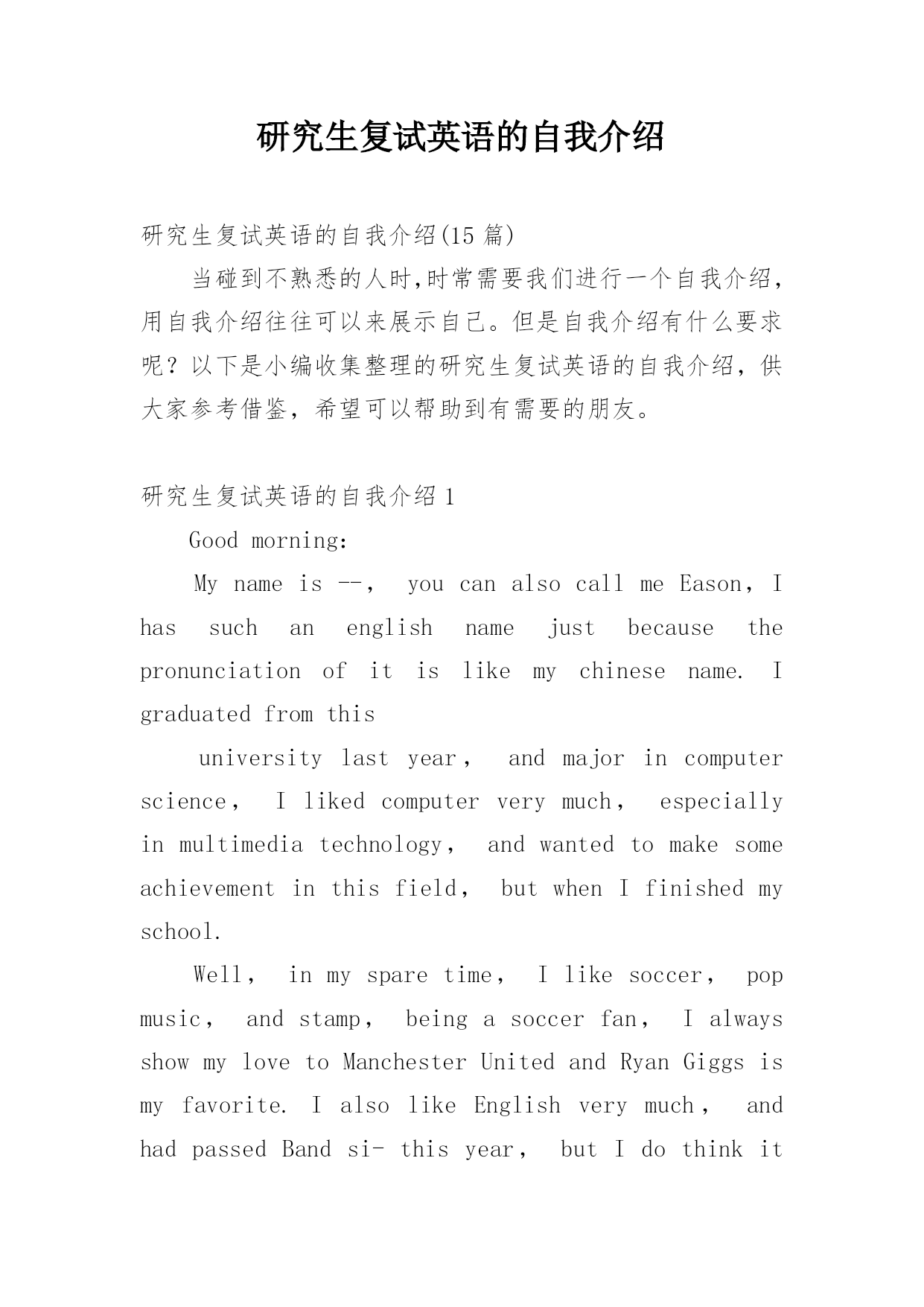 研究生复试英语的自我介绍研究生复试英语的自我介绍(15篇)当碰到不熟悉的人时,时常需要我们进行一个自我介绍,用自我介绍往往可以来展示自己。但是自我介绍有什么要求呢?以下是小编收集整理的研究生复试英语的自我介绍,供大家参考借鉴,希望可以帮助到有需要的朋友。研究生复试英语的自我介绍1Goodmorning:Mynameis--,youcanalsocallmeEason,Ihassuchanenglishnamejustbecausethepronunciationofitislikemychinesenam
