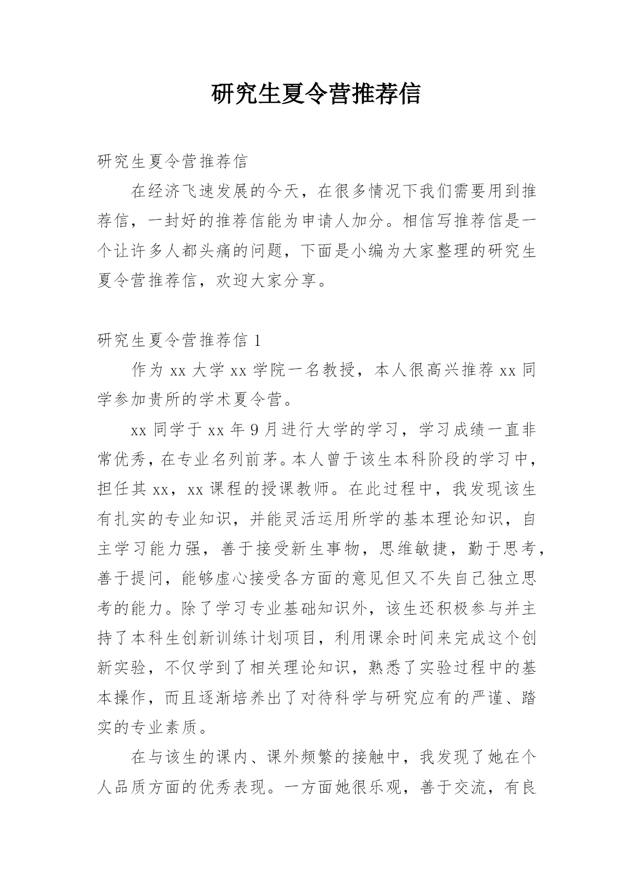 研究生夏令营推荐信研究生夏令营推荐信在经济飞速发展的今天,在很多情况下我们需要用到推荐信,一封好的推荐信能为申请人加分。相信写推荐信是一个让许多人都头痛的问题,下面是小编为大家整理的研究生夏令营推荐信,欢迎大家分享。研究生夏令营推荐信1作为xx大学xx学院一名教授,本人很高兴推荐xx同学参加贵所的学术夏令营。xx同学于xx年9月进行大学的学习,学习成绩一直非常优秀,在专业名列前茅。本人曾于该生本科阶段的学习中,担任其xx,xx课程的授课教师。在此过程中,我发现该生有扎实的专业知识,并能灵活运用所学的基本理
