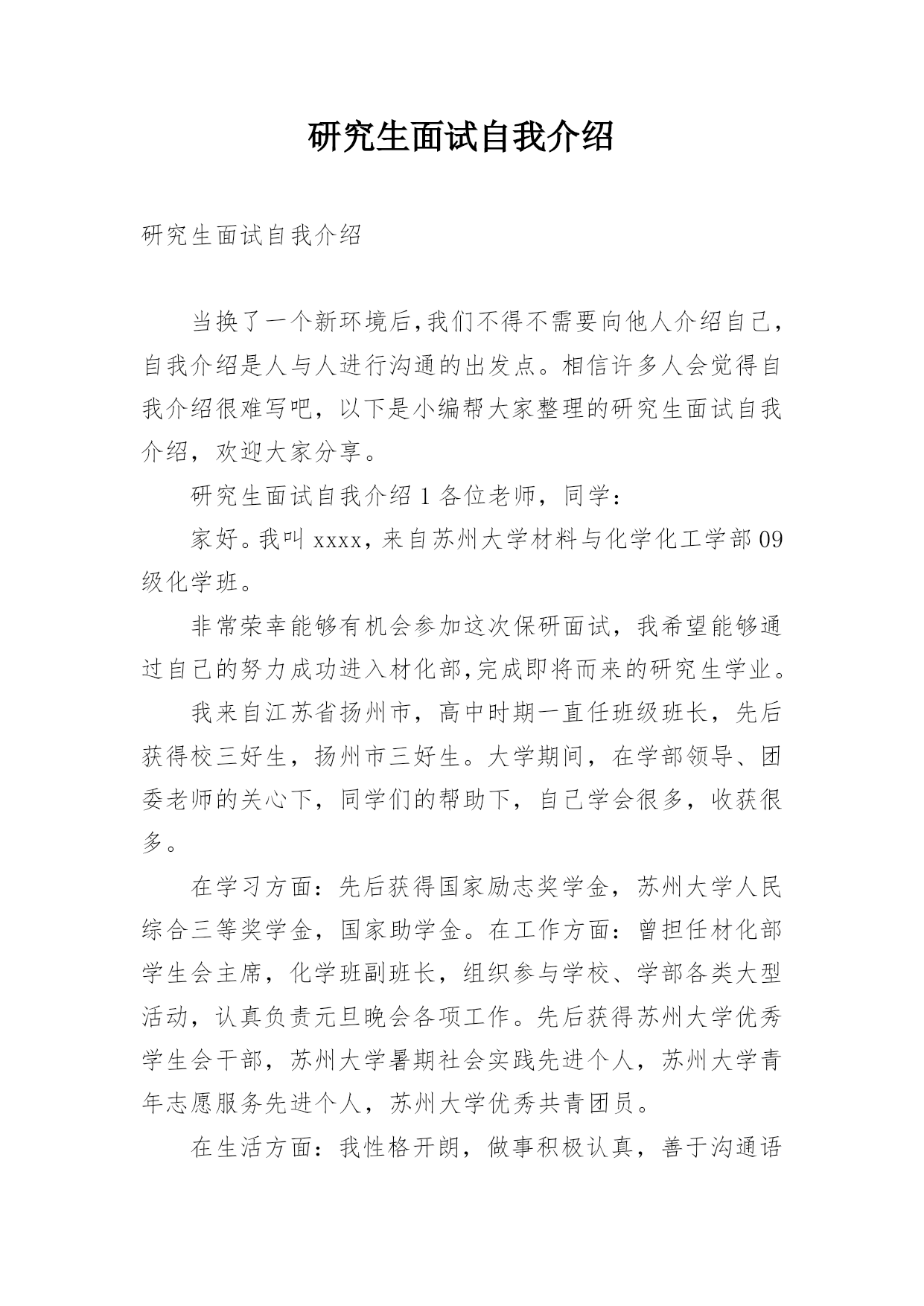 研究生面试自我介绍研究生面试自我介绍当换了一个新环境后,我们不得不需要向他人介绍自己,自我介绍是人与人进行沟通的出发点。相信许多人会觉得自我介绍很难写吧,以下是小编帮大家整理的研究生面试自我介绍,欢迎大家分享。研究生面试自我介绍1各位老师,同学:家好。我叫xxxx,来自苏州大学材料与化学化工学部09级化学班。非常荣幸能够有机会参加这次保研面试,我希望能够通过自己的努力成功进入材化部,完成即将而来的研究生学业。我来自江苏省扬州市,高中时期一直任班级班长,先后获得校三好生,扬州市三好生。大学期间,在学部领导、