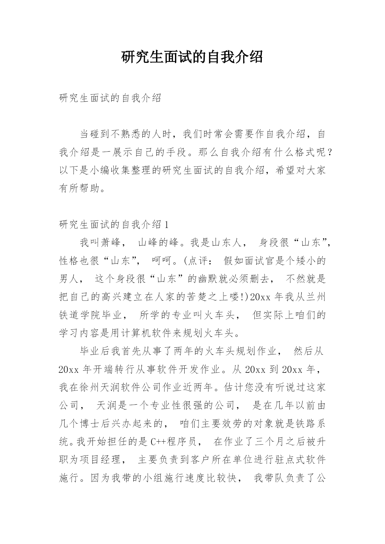 研究生面试的自我介绍研究生面试的自我介绍当碰到不熟悉的人时,我们时常会需要作自我介绍,自我介绍是一展示自己的手段。那么自我介绍有什么格式呢?以下是小编收集整理的研究生面试的自我介绍,希望对大家有所帮助。研究生面试的自我介绍1我叫萧峰,山峰的峰。我是山东人,身段很“山东”,性格也很“山东”,呵呵。(点评:假如面试官是个矮小的男人,这个身段很“山东”的幽默就必须删去,不然就是把自己的高兴建立在人家的苦楚之上喽!)20xx年我从兰州铁道学院毕业,所学的专业叫火车头,但实际上咱们的学习内容是用计算机软件来规划火车