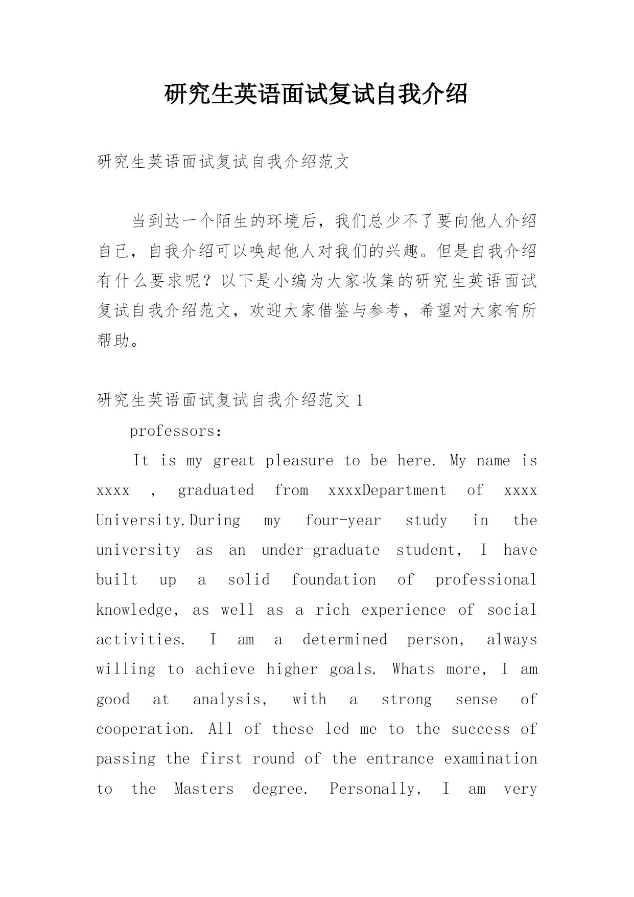 研究生英语面试复试自我介绍研究生英语面试复试自我介绍范文当到达一个陌生的环境后,我们总少不了要向他人介绍自己,自我介绍可以唤起他人对我们的兴趣。但是自我介绍有什么要求呢?以下是小编为大家收集的研究生英语面试复试自我介绍范文,欢迎大家借鉴与参考,希望对大家有所帮助。研究生英语面试复试自我介绍范文1professors:Itismygreatpleasuretobehere.Mynameisxxxx,graduatedfromxxxxDepartmentofxxxxUniversity.Duringmyfou
