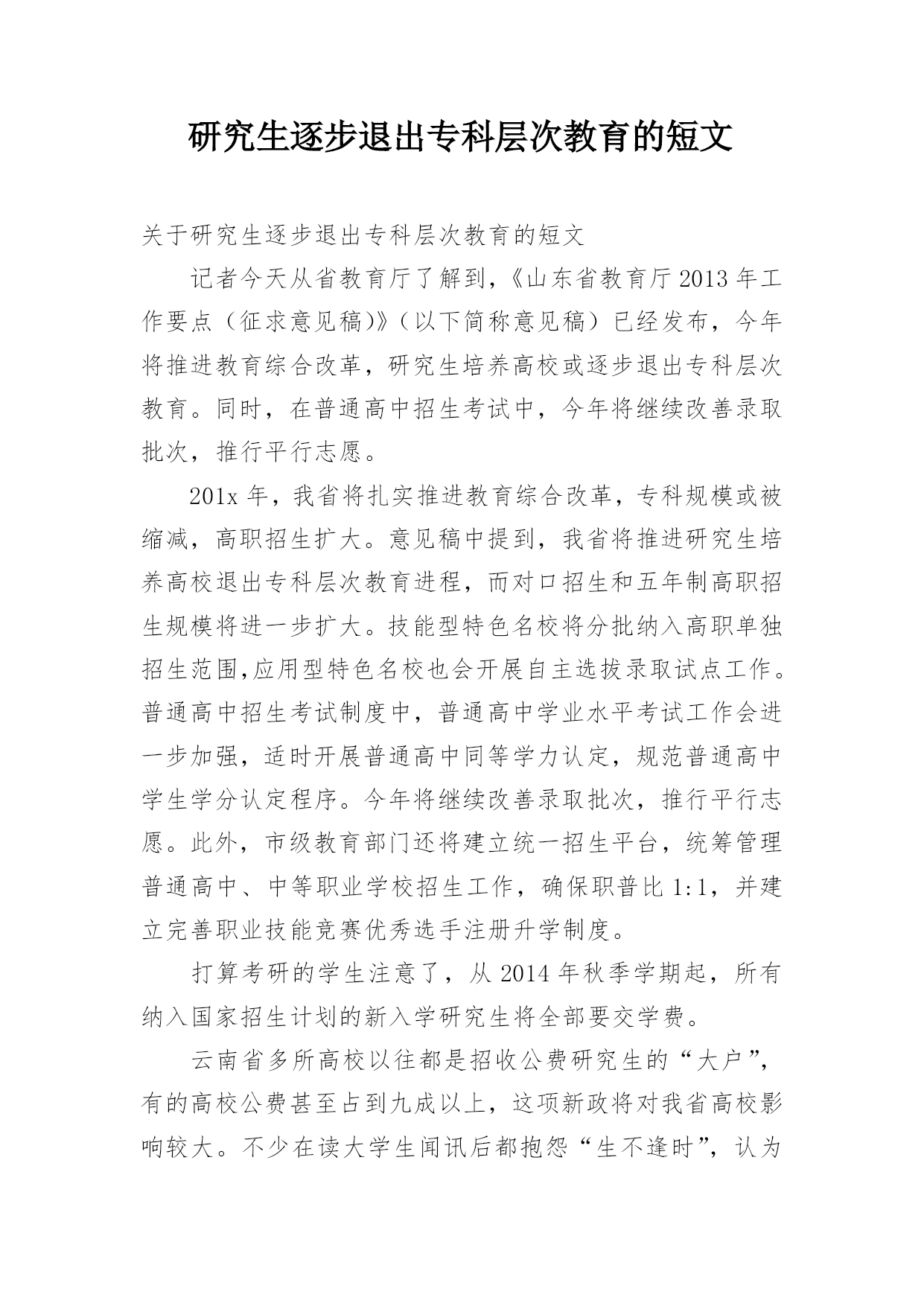 研究生逐步退出专科层次教育的短文关于研究生逐步退出专科层次教育的短文记者今天从省教育厅了解到,《山东省教育厅2013年工作要点(征求意见稿)》(以下简称意见稿)已经发布,今年将推进教育综合改革,研究生培养高校或逐步退出专科层次教育。同时,在普通高中招生考试中,今年将继续改善录取批次,推行平行志愿。201x年,我省将扎实推进教育综合改革,专科规模或被缩减,高职招生扩大。意见稿中提到,我省将推进研究生培养高校退出专科层次教育进程,而对口招生和五年制高职招生规模将进一步扩大。技能型特色名校将分批纳入高职单独招生