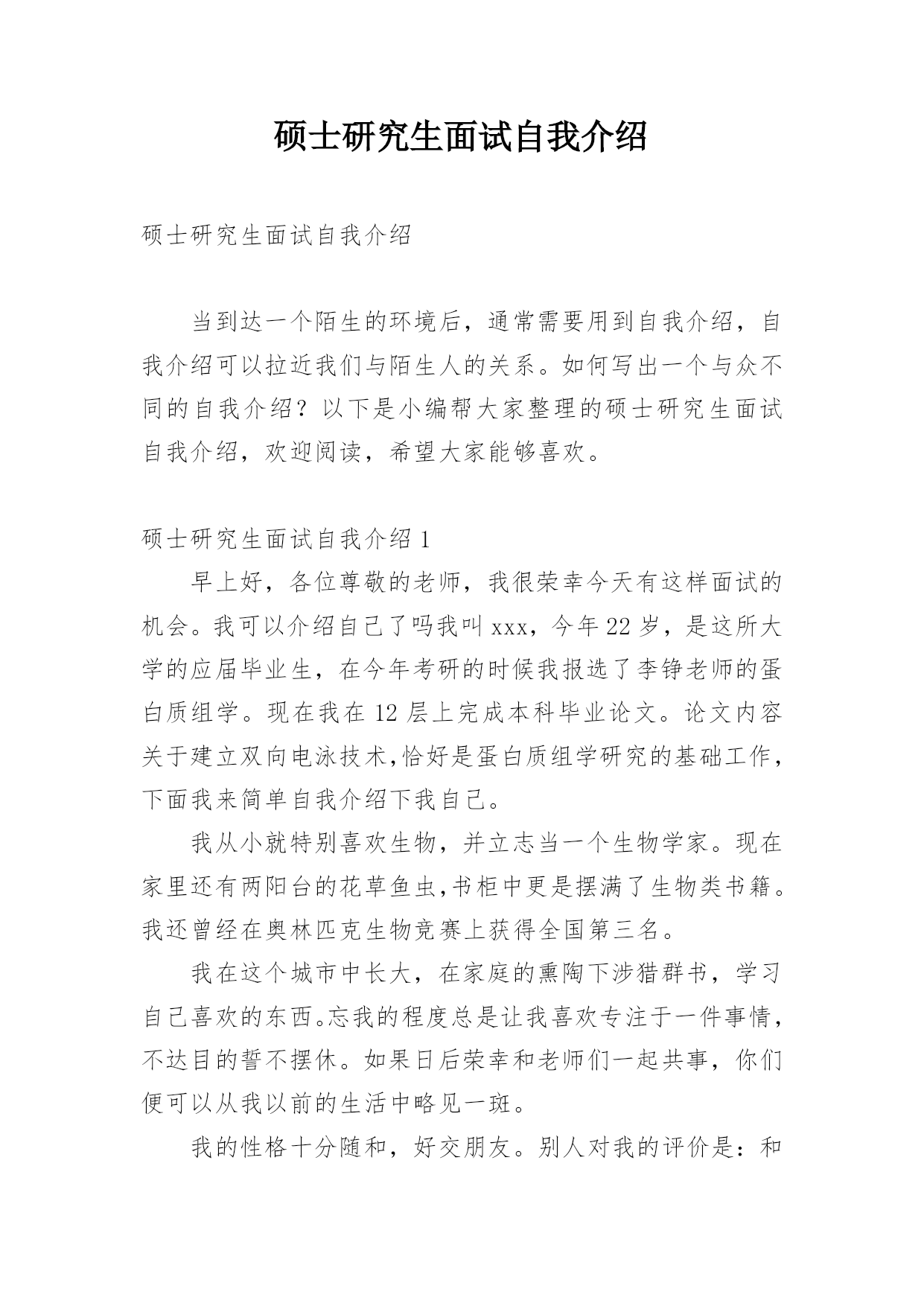 硕士研究生面试自我介绍硕士研究生面试自我介绍当到达一个陌生的环境后,通常需要用到自我介绍,自我介绍可以拉近我们与陌生人的关系。如何写出一个与众不同的自我介绍?以下是小编帮大家整理的硕士研究生面试自我介绍,欢迎阅读,希望大家能够喜欢。硕士研究生面试自我介绍1早上好,各位尊敬的老师,我很荣幸今天有这样面试的机会。我可以介绍自己了吗我叫xxx,今年22岁,是这所大学的应届毕业生,在今年考研的时候我报选了李铮老师的蛋白质组学。现在我在12层上完成本科毕业论文。论文内容关于建立双向电泳技术,恰好是蛋白质组学研究的基