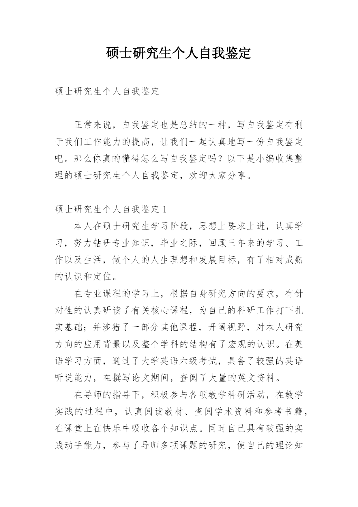 硕士研究生个人自我鉴定硕士研究生个人自我鉴定正常来说,自我鉴定也是总结的一种,写自我鉴定有利于我们工作能力的提高,让我们一起认真地写一份自我鉴定吧。那么你真的懂得怎么写自我鉴定吗?以下是小编收集整理的硕士研究生个人自我鉴定,欢迎大家分享。硕士研究生个人自我鉴定1本人在硕士研究生学习阶段,思想上要求上进,认真学习,努力钻研专业知识,毕业之际,回顾三年来的学习、工作以及生活,做个人的人生理想和发展目标,有了相对成熟的认识和定位。在专业课程的学习上,根据自身研究方向的要求,有针对性的认真研读了有关核心课程,为自