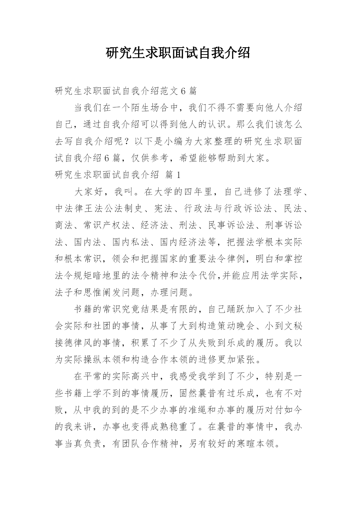 研究生求职面试自我介绍研究生求职面试自我介绍范文6篇当我们在一个陌生场合中,我们不得不需要向他人介绍自己,通过自我介绍可以得到他人的认识。那么我们该怎么去写自我介绍呢?以下是小编为大家整理的研究生求职面试自我介绍6篇,仅供参考,希望能够帮助到大家。研究生求职面试自我介绍篇1大家好,我叫。在大学的四年里,自己进修了法理学、中法律王法公法制史、宪法、行政法与行政诉讼法、民法、商法、常识产权法、经济法、刑法、民事诉讼法、刑事诉讼法、国内法、国内私法、国内经济法等,把握法学根本实际和根本常识,领会和把握国家的重要