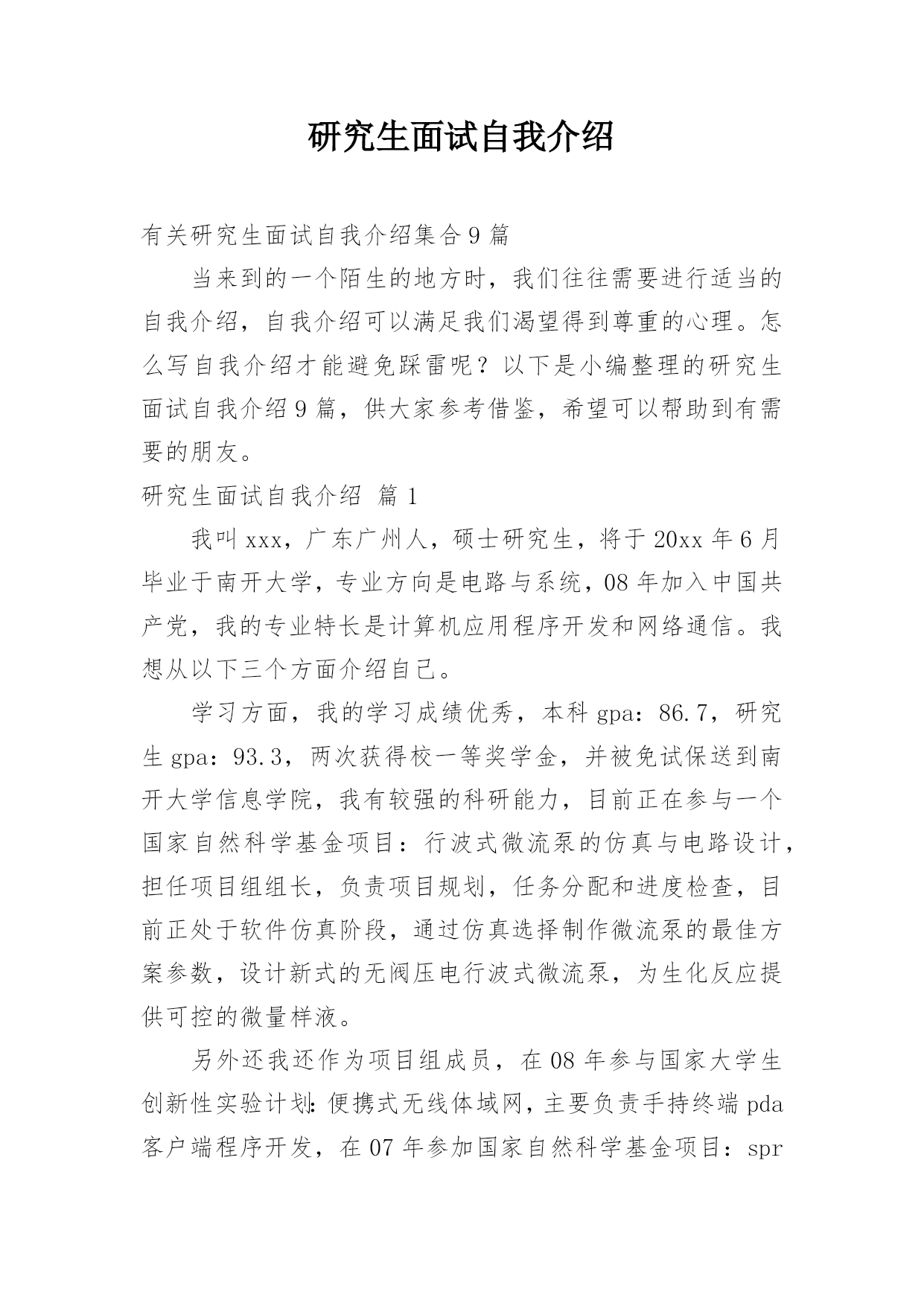 研究生面试自我介绍有关研究生面试自我介绍集合9篇当来到的一个陌生的地方时,我们往往需要进行适当的自我介绍,自我介绍可以满足我们渴望得到尊重的心理。怎么写自我介绍才能避免踩雷呢?以下是小编整理的研究生面试自我介绍9篇,供大家参考借鉴,希望可以帮助到有需要的朋友。研究生面试自我介绍篇1我叫xxx,广东广州人,硕士研究生,将于20xx年6月毕业于南开大学,专业方向是电路与系统,08年加入中国共产党,我的专业特长是计算机应用程序开发和网络通信。我想从以下三个方面介绍自己。学习方面,我的学习成绩优秀,本科gpa:8