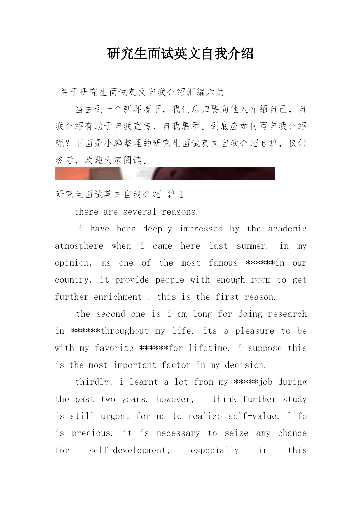 研究生面试英文自我介绍关于研究生面试英文自我介绍汇编六篇当去到一个新环境下,我们总归要向他人介绍自己,自我介绍有助于自我宣传、自我展示。到底应如何写自我介绍呢?下面是小编整理的研究生面试英文自我介绍6篇,仅供参考,欢迎大家阅读。研究生面试英文自我介绍篇1thereareseveralreasons.ihavebeendeeplyimpressedbytheacademicatmospherewhenicameherelastsummer.inmyopinion,asoneofthemostfamous**