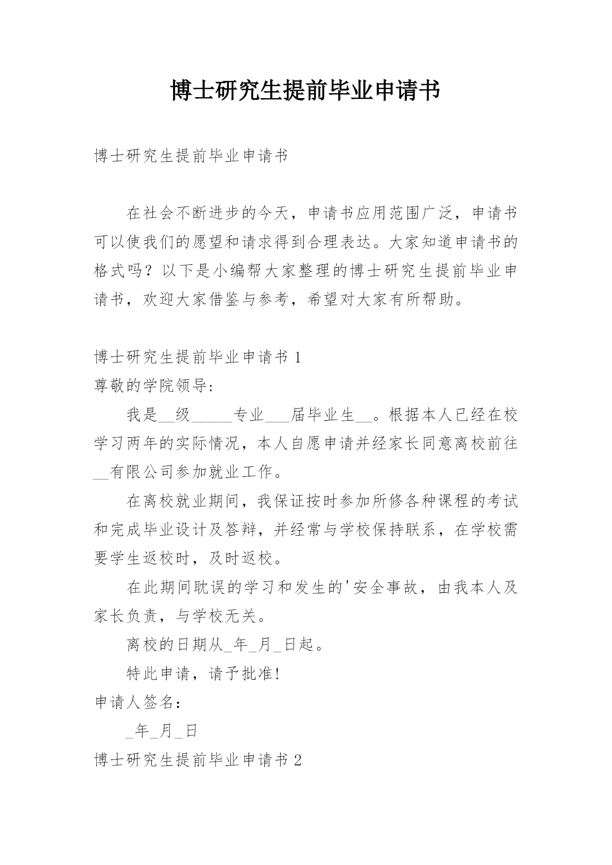 博士研究生提前毕业申请书博士研究生提前毕业申请书在社会不断进步的今天,申请书应用范围广泛,申请书可以使我们的愿望和请求得到合理表达。大家知道申请书的格式吗?以下是小编帮大家整理的博士研究生提前毕业申请书,欢迎大家借鉴与参考,希望对大家有所帮助。博士研究生提前毕业申请书1尊敬的学院领导:我是__级_____专业___届毕业生__。根据本人已经在校学习两年的实际情况,本人自愿申请并经家长同意离校前往__有限公司参加就业工作。在离校就业期间,我保证按时参加所修各种课程的考试和完成毕业设计及答辩,并经常与学校保持