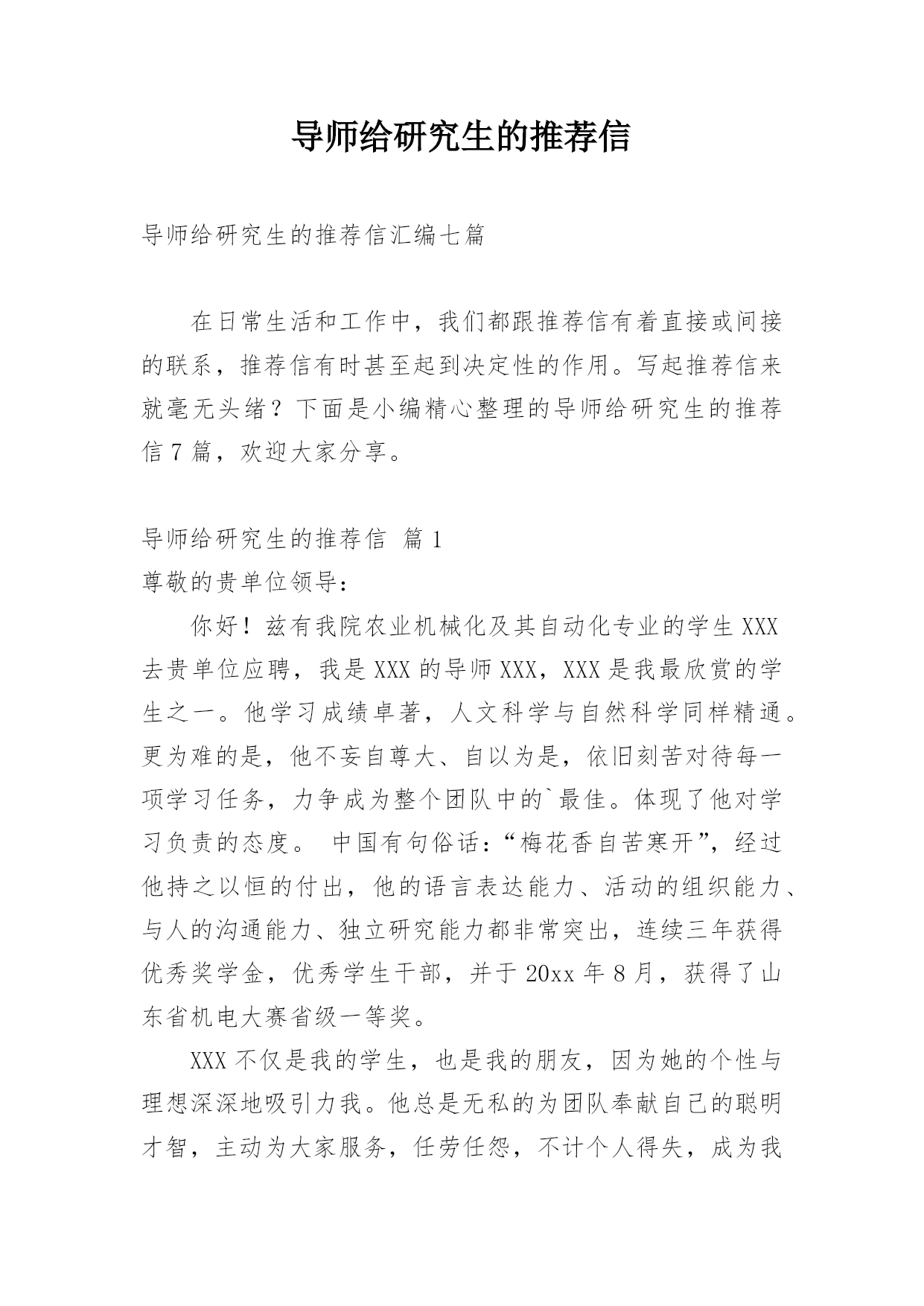 导师给研究生的推荐信导师给研究生的推荐信汇编七篇在日常生活和工作中,我们都跟推荐信有着直接或间接的联系,推荐信有时甚至起到决定性的作用。写起推荐信来就毫无头绪?下面是小编精心整理的导师给研究生的推荐信7篇,欢迎大家分享。导师给研究生的推荐信篇1尊敬的贵单位领导:你好!兹有我院农业机械化及其自动化专业的学生XXX去贵单位应聘,我是XXX的导师XXX,XXX是我最欣赏的学生之一。他学习成绩卓著,人文科学与自然科学同样精通。更为难的是,他不妄自尊大、自以为是,依旧刻苦对待每一项学习任务,力争成为整个团队中的`最