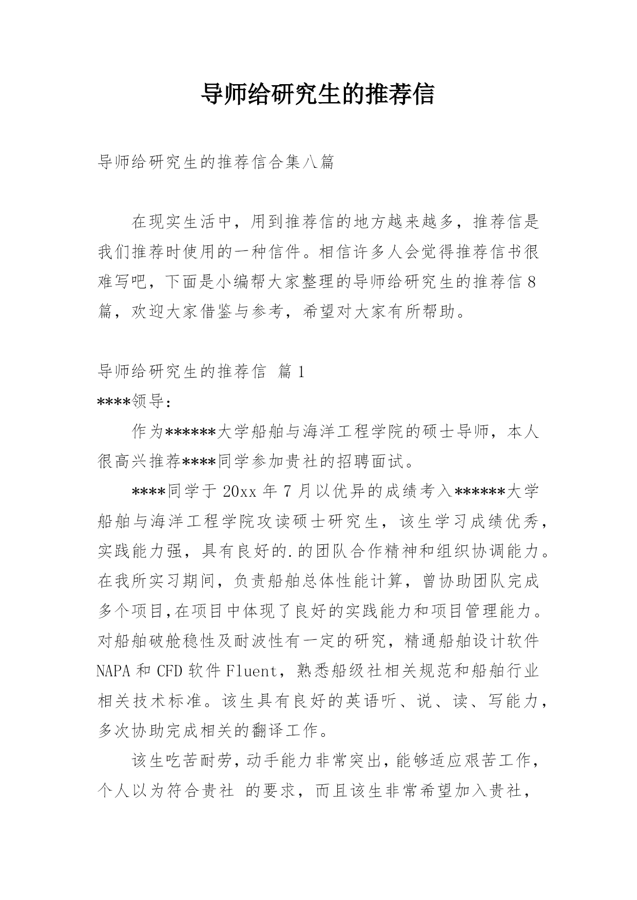 导师给研究生的推荐信导师给研究生的推荐信合集八篇在现实生活中,用到推荐信的地方越来越多,推荐信是我们推荐时使用的一种信件。相信许多人会觉得推荐信书很难写吧,下面是小编帮大家整理的导师给研究生的推荐信8篇,欢迎大家借鉴与参考,希望对大家有所帮助。导师给研究生的推荐信篇1****领导:作为******大学船舶与海洋工程学院的硕士导师,本人很高兴推荐****同学参加贵社的招聘面试。****同学于20xx年7月以优异的成绩考入******大学船舶与海洋工程学院攻读硕士研究生,该生学习成绩优秀,实践能力强,具有良好