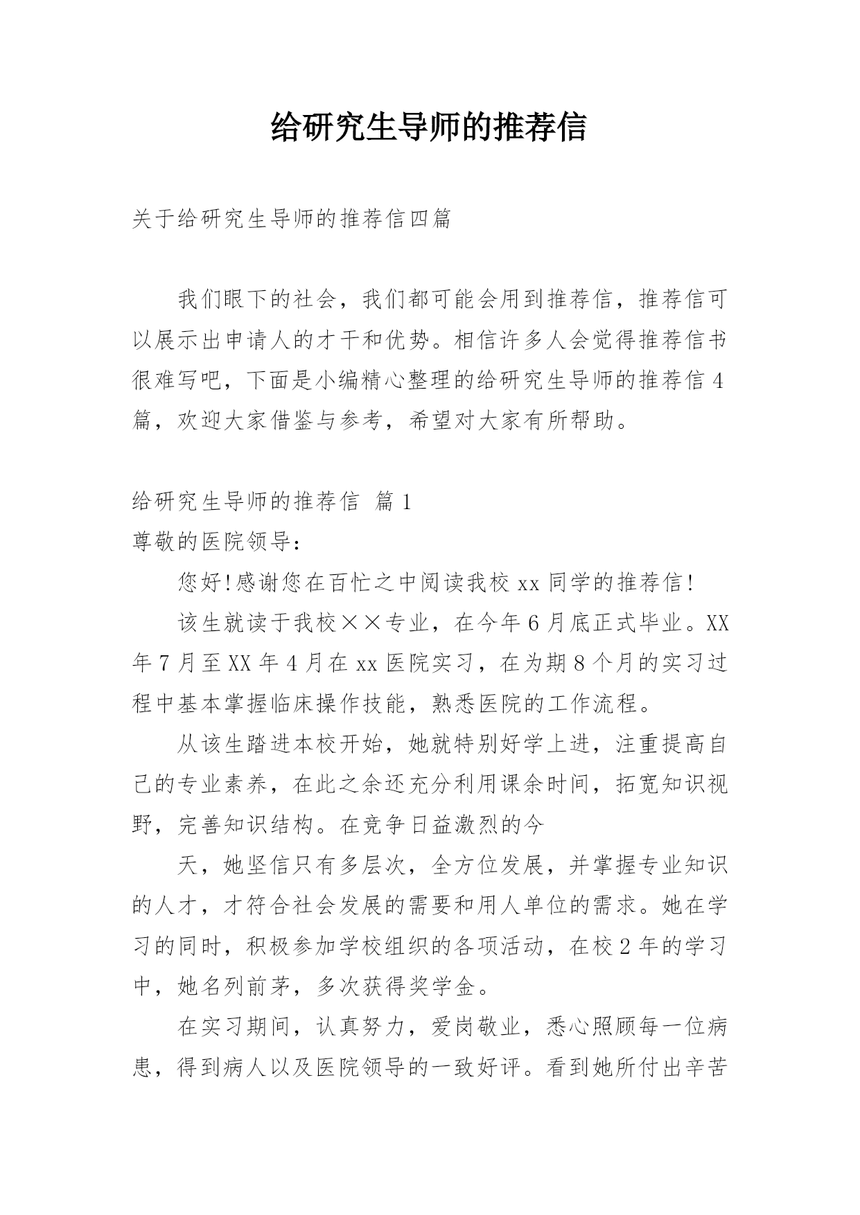 给研究生导师的推荐信关于给研究生导师的推荐信四篇我们眼下的社会,我们都可能会用到推荐信,推荐信可以展示出申请人的才干和优势。相信许多人会觉得推荐信书很难写吧,下面是小编精心整理的给研究生导师的推荐信4篇,欢迎大家借鉴与参考,希望对大家有所帮助。给研究生导师的推荐信篇1尊敬的医院领导:您好!感谢您在百忙之中阅读我校xx同学的推荐信!该生就读于我校××专业,在今年6月底正式毕业。XX年7月至XX年4月在xx医院实习,在为期8个月的实习过程中基本掌握临床操作技能,熟悉医院的工作流程。从该生踏进本校开始,她就特别