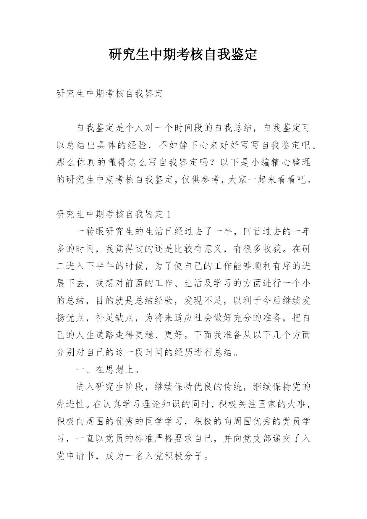 研究生中期考核自我鉴定研究生中期考核自我鉴定自我鉴定是个人对一个时间段的自我总结,自我鉴定可以总结出具体的经验,不如静下心来好好写写自我鉴定吧。那么你真的懂得怎么写自我鉴定吗?以下是小编精心整理的研究生中期考核自我鉴定,仅供参考,大家一起来看看吧。研究生中期考核自我鉴定1一转眼研究生的生活已经过去了一半,回首过去的一年多的时间,我觉得过的还是比较有意义,有很多收获。在研二进入下半年的时候,为了使自己的工作能够顺利有序的进展下去,我想对前面的工作、生活及学习的方面进行一个小的总结,目的就是总结经验,发现不足