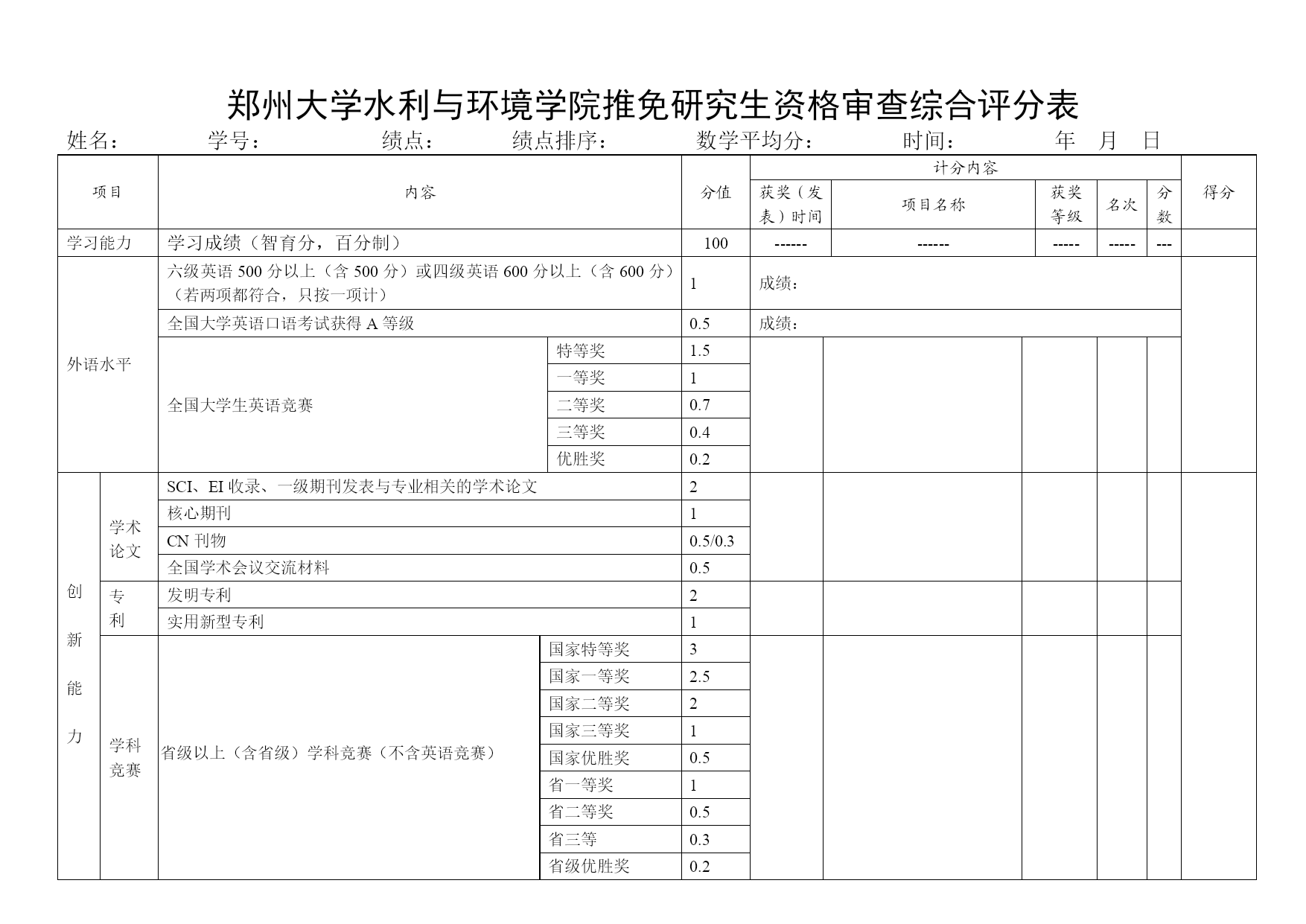 郑州大学水利与环境学院推免研究生资格审查综合评分表姓名:学号:绩点:绩点排序:数学平均分:时间:年月日项目内容分值计分内容得分获奖(发表)时间项目名称获奖等级名次分数学习能力学习成绩(智育分,百分制)100-------------------------外语水平六级英语500分以上(含500分)或四级英语600分以上(含600分)(若两项都符合,只按一项计)1成绩:全国大学英语口语考试获得A等级0.5成绩:全国大学生英语竞赛特等奖1.5一等奖1二等奖0.7三等奖0.4优胜奖0.2创新能力学术论文SCI、