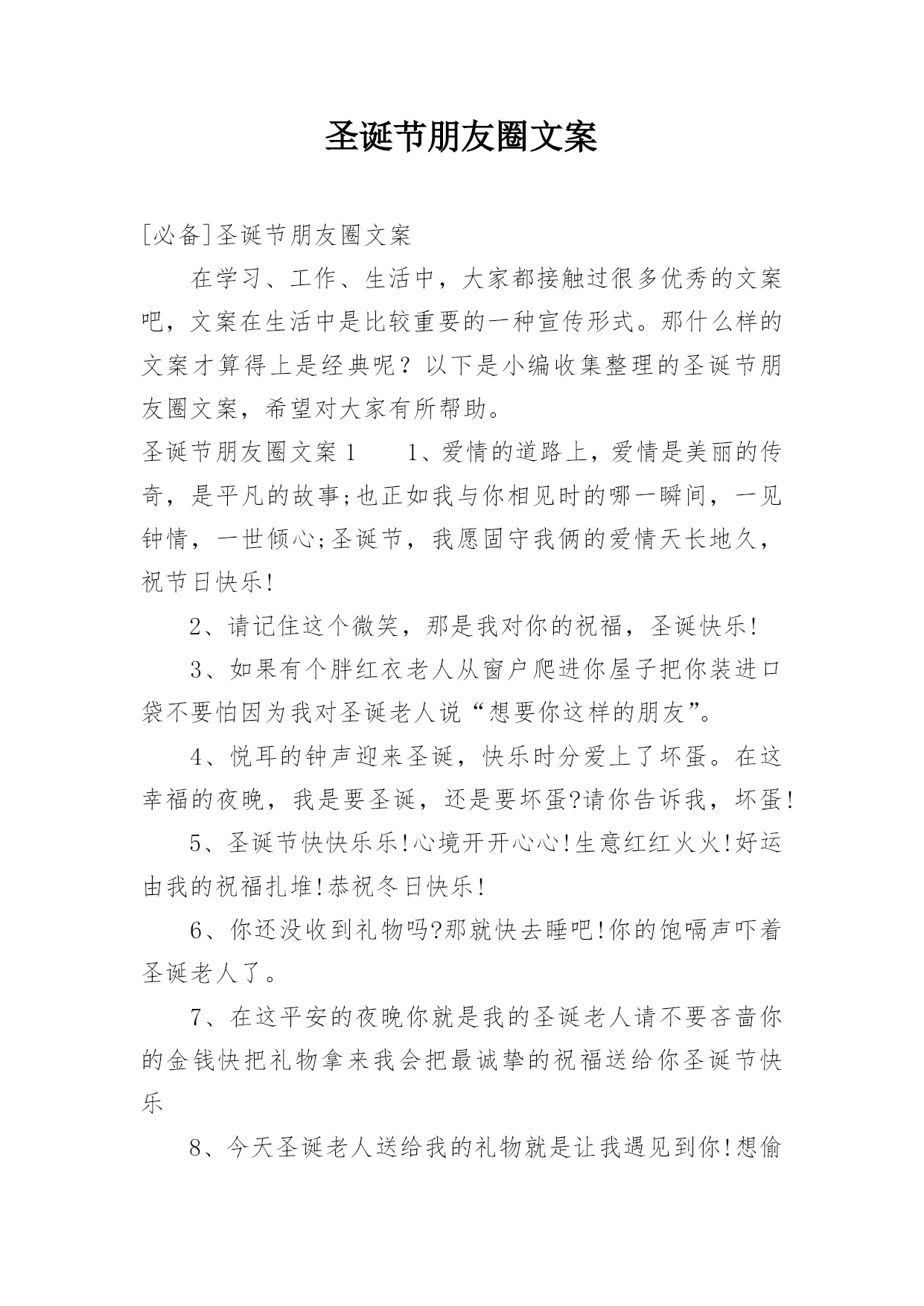圣诞节朋友圈文案[必备]圣诞节朋友圈文案在学习、工作、生活中,大家都接触过很多优秀的文案吧,文案在生活中是比较重要的一种宣传形式。那什么样的文案才算得上是经典呢?以下是小编收集整理的圣诞节朋友圈文案,希望对大家有所帮助。圣诞节朋友圈文案11、爱情的道路上,爱情是美丽的传奇,是平凡的故事;也正如我与你相见时的哪一瞬间,一见钟情,一世倾心;圣诞节,我愿固守我俩的爱情天长地久,祝节日快乐!2、请记住这个微笑,那是我对你的祝福,圣诞快乐!3、如果有个胖红衣老人从窗户爬进你屋子把你装进口袋不要怕因为我对圣诞老人说“