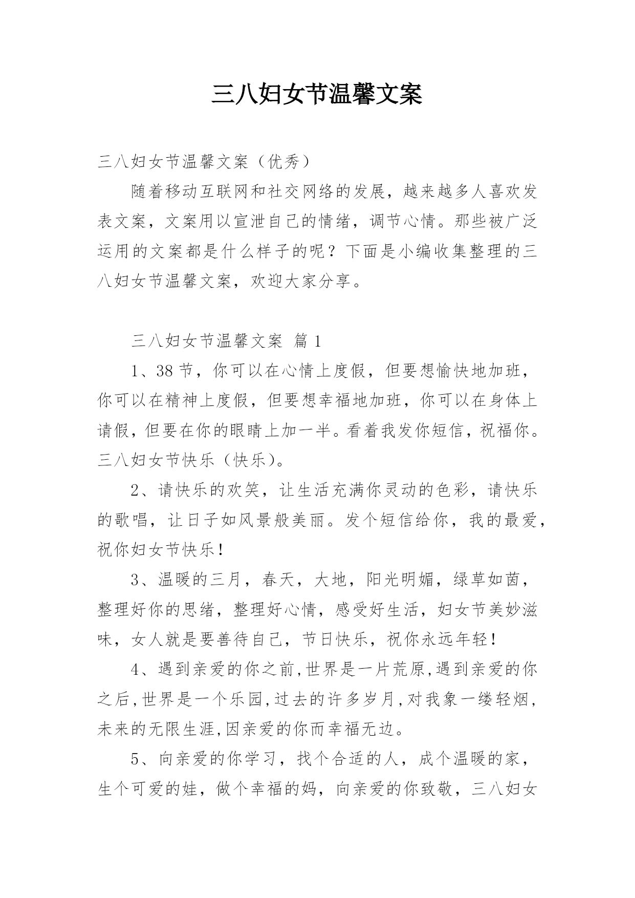 三八妇女节温馨文案三八妇女节温馨文案(优秀)随着移动互联网和社交网络的发展,越来越多人喜欢发表文案,文案用以宣泄自己的情绪,调节心情。那些被广泛运用的文案都是什么样子的呢?下面是小编收集整理的三八妇女节温馨文案,欢迎大家分享。三八妇女节温馨文案篇11、38节,你可以在心情上度假,但要想愉快地加班,你可以在精神上度假,但要想幸福地加班,你可以在身体上请假,但要在你的眼睛上加一半。看着我发你短信,祝福你。三八妇女节快乐(快乐)。2、请快乐的欢笑,让生活充满你灵动的色彩,请快乐的歌唱,让日子如风景般美丽。发个短