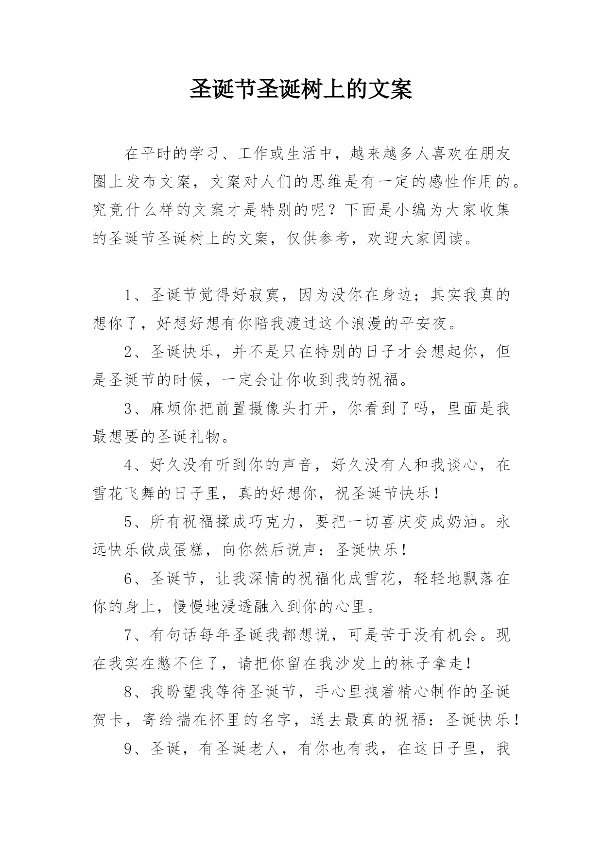 圣诞节圣诞树上的文案在平时的学习、工作或生活中,越来越多人喜欢在朋友圈上发布文案,文案对人们的思维是有一定的感性作用的。究竟什么样的文案才是特别的呢?下面是小编为大家收集的圣诞节圣诞树上的文案,仅供参考,欢迎大家阅读。1、圣诞节觉得好寂寞,因为没你在身边;其实我真的想你了,好想好想有你陪我渡过这个浪漫的平安夜。2、圣诞快乐,并不是只在特别的日子才会想起你,但是圣诞节的时候,一定会让你收到我的祝福。3、麻烦你把前置摄像头打开,你看到了吗,里面是我最想要的圣诞礼物。4、好久没有听到你的声音,好久没有人和我谈心